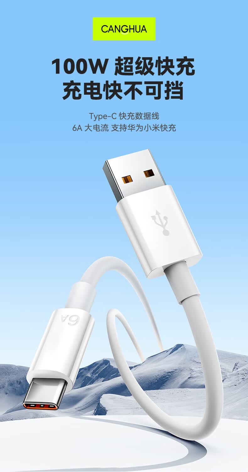 CangHua Type-c充电线2米6A/5A超级快充100W/88W/66W数据线适用华为mate80/pura70荣耀小米安卓手机车载线