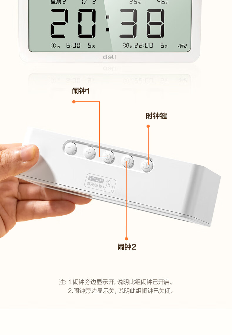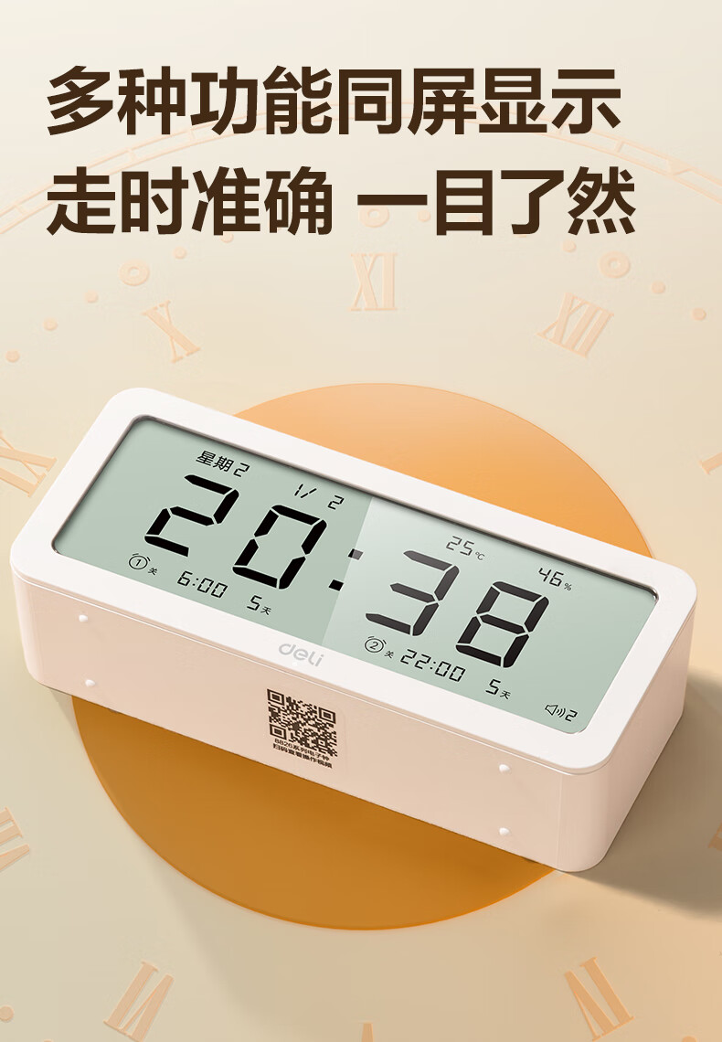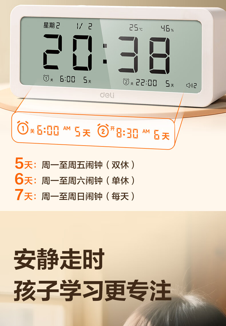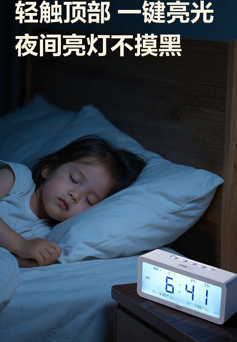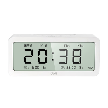 得力(deli)儿童节多功能电子闹钟学生儿童专用起床神器电子时钟温湿度计 白色开学必备开学季新年礼物