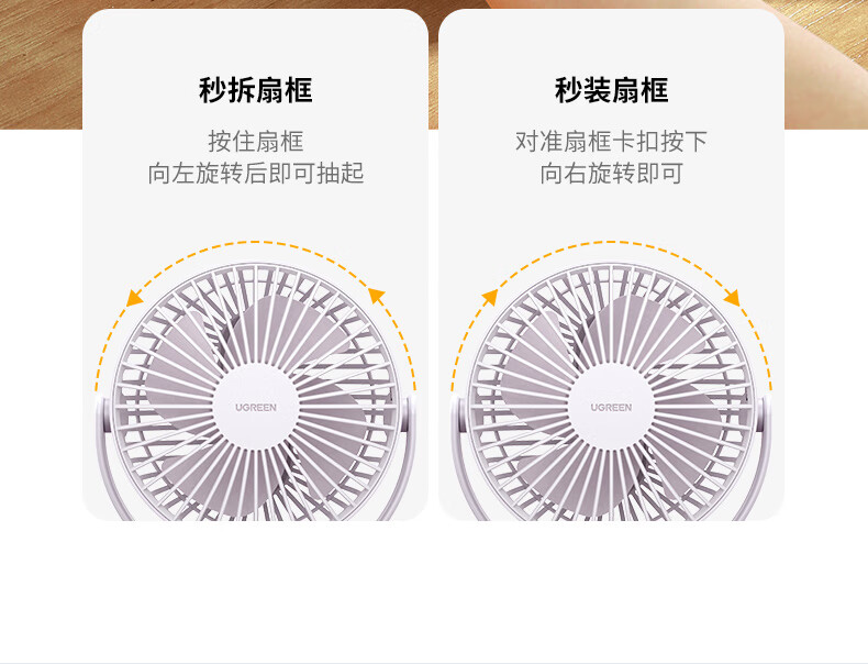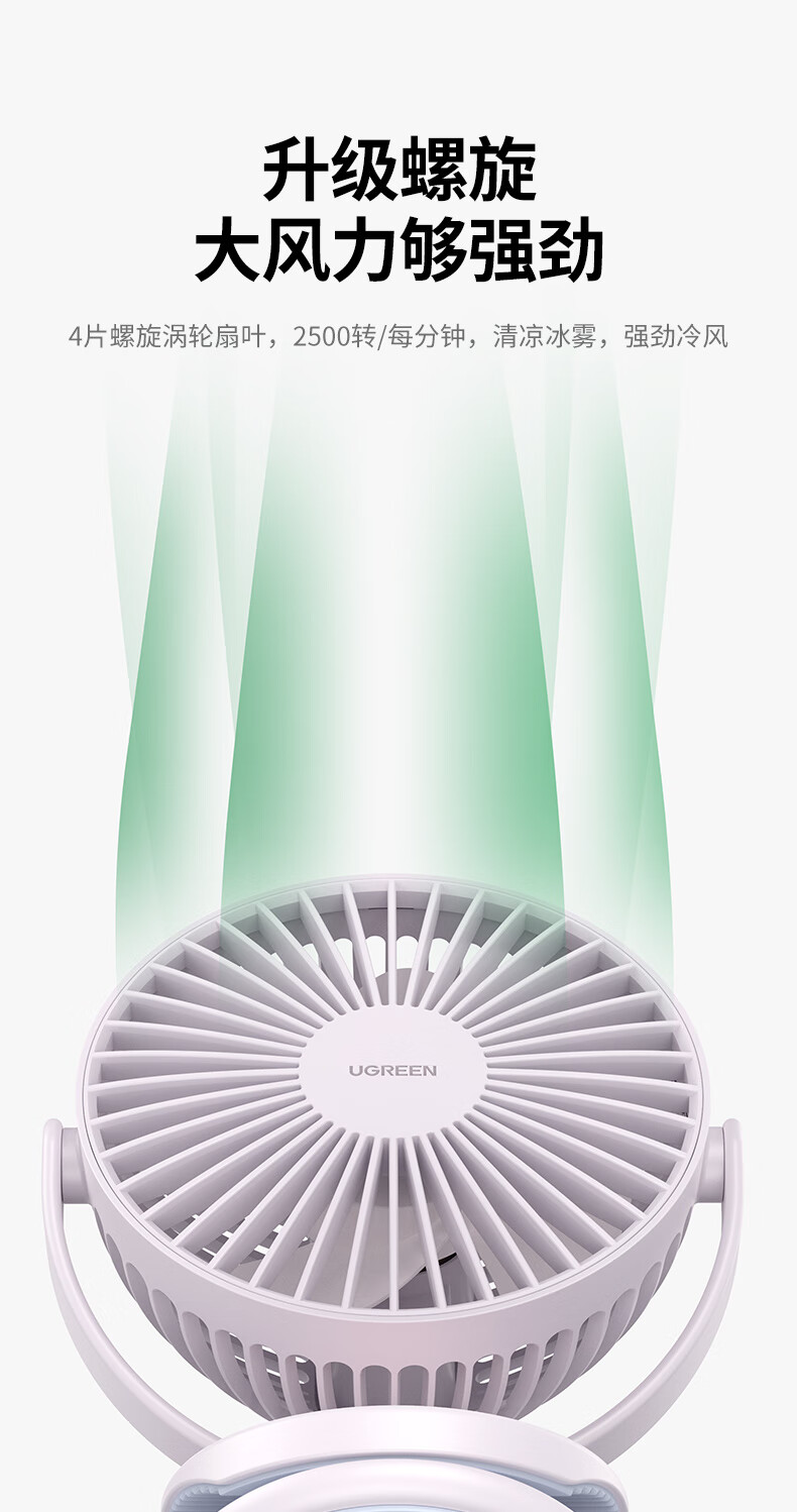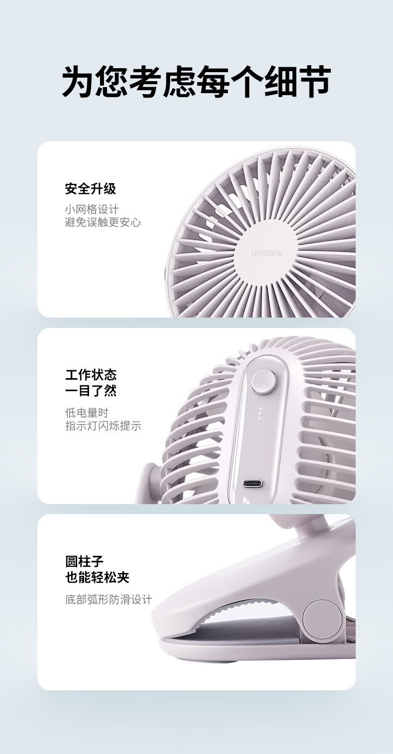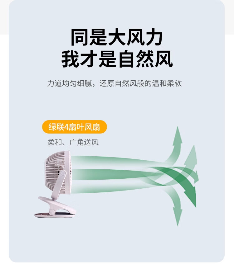 绿联 USB小风扇 办公室桌面学生宿舍床头低噪充电式电风扇 随身便携式迷你手持小型夹子风扇车载