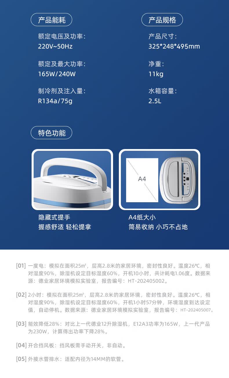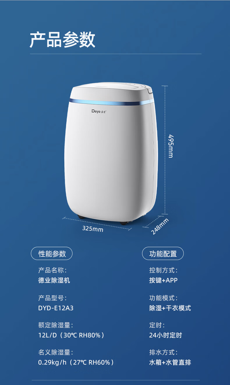 德业(Deye)除湿机/抽湿机 除湿量12升/天 25㎡家用轻音吸湿器地下室干燥机干衣机 低功耗 手机智控DYD-E12A3