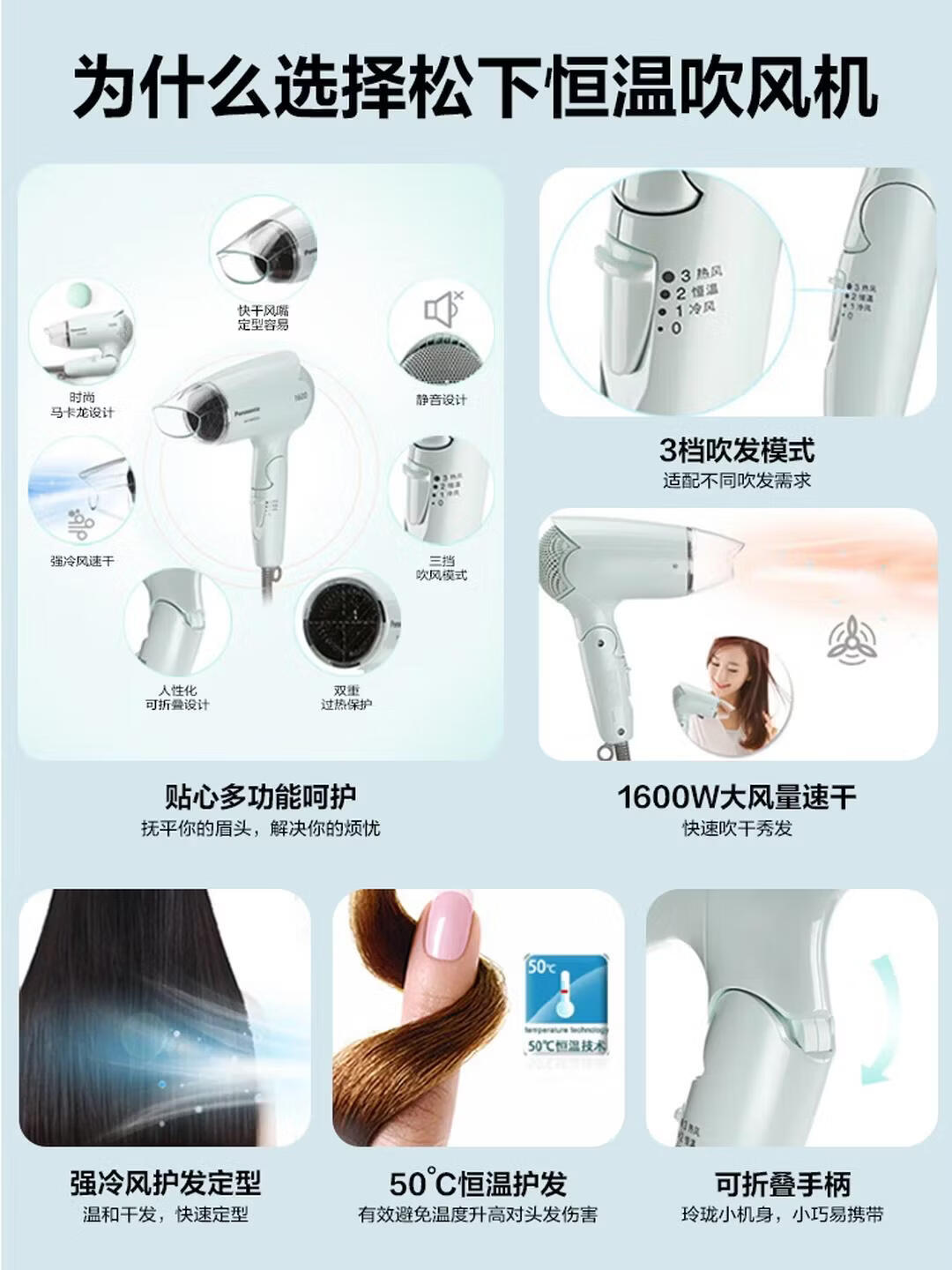 松下(Panasonic)家用吹风机大功率速干迷你护发电吹风不伤发宿舍母亲节礼物淡蓝色EH-WND2G