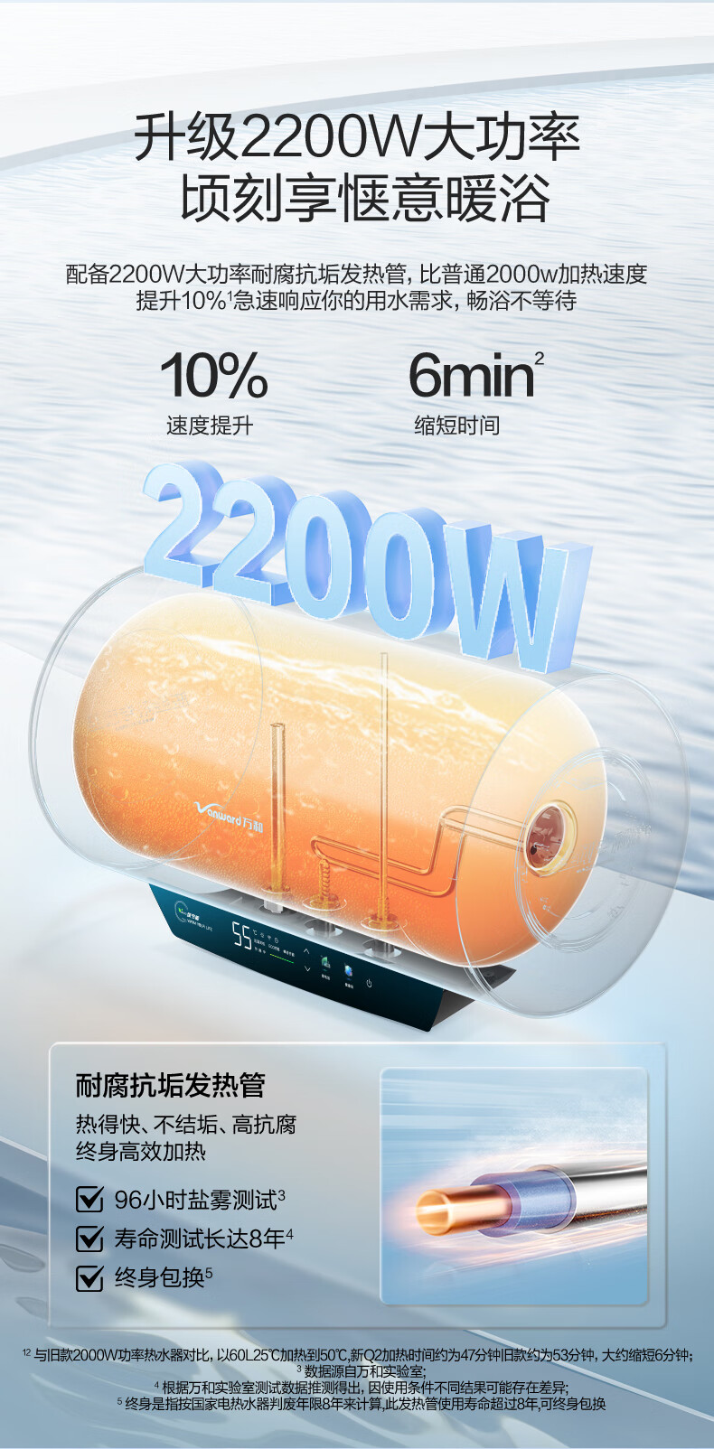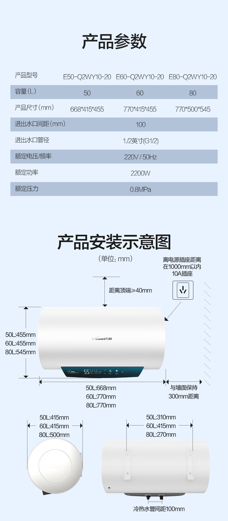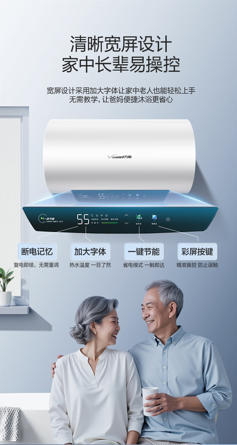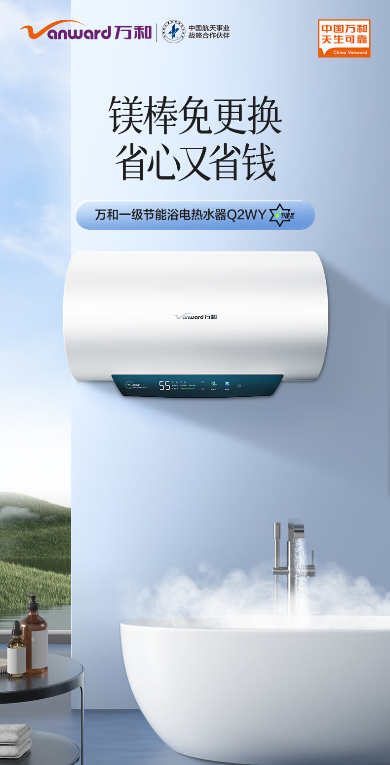 万和(Vanward)【节能星Q2】60升电热水器2200W速热免换镁棒超一级能效智感断电防护抑菌净水上门安装