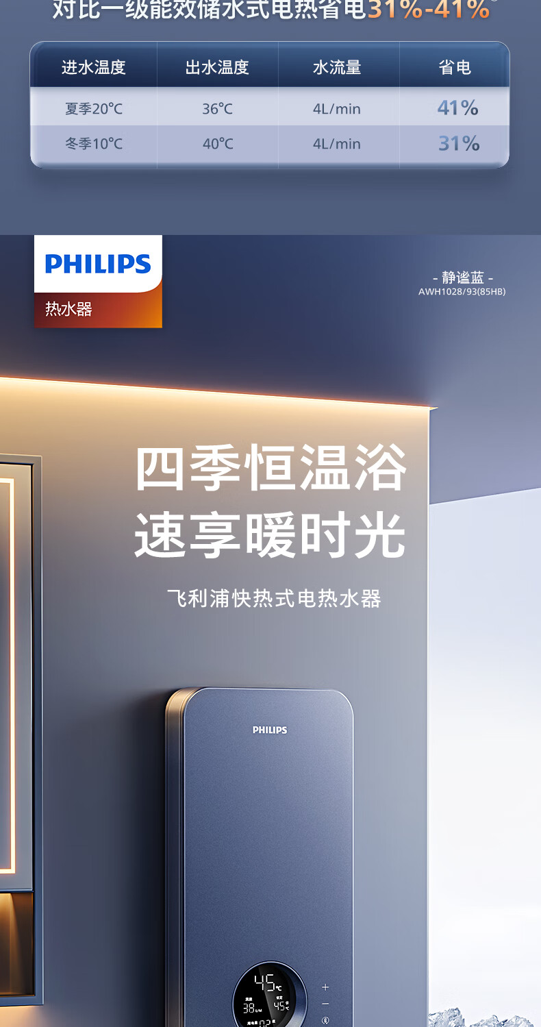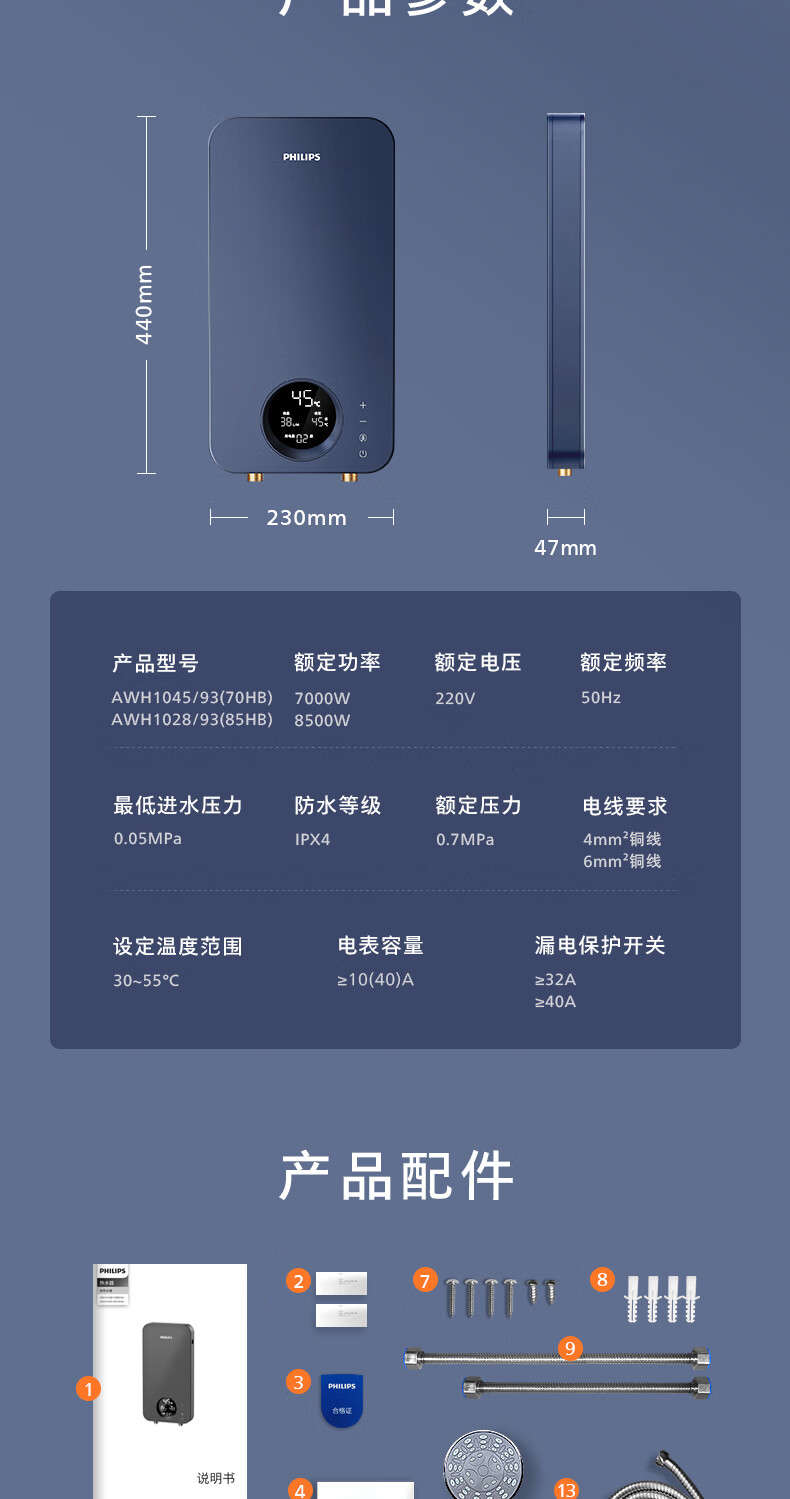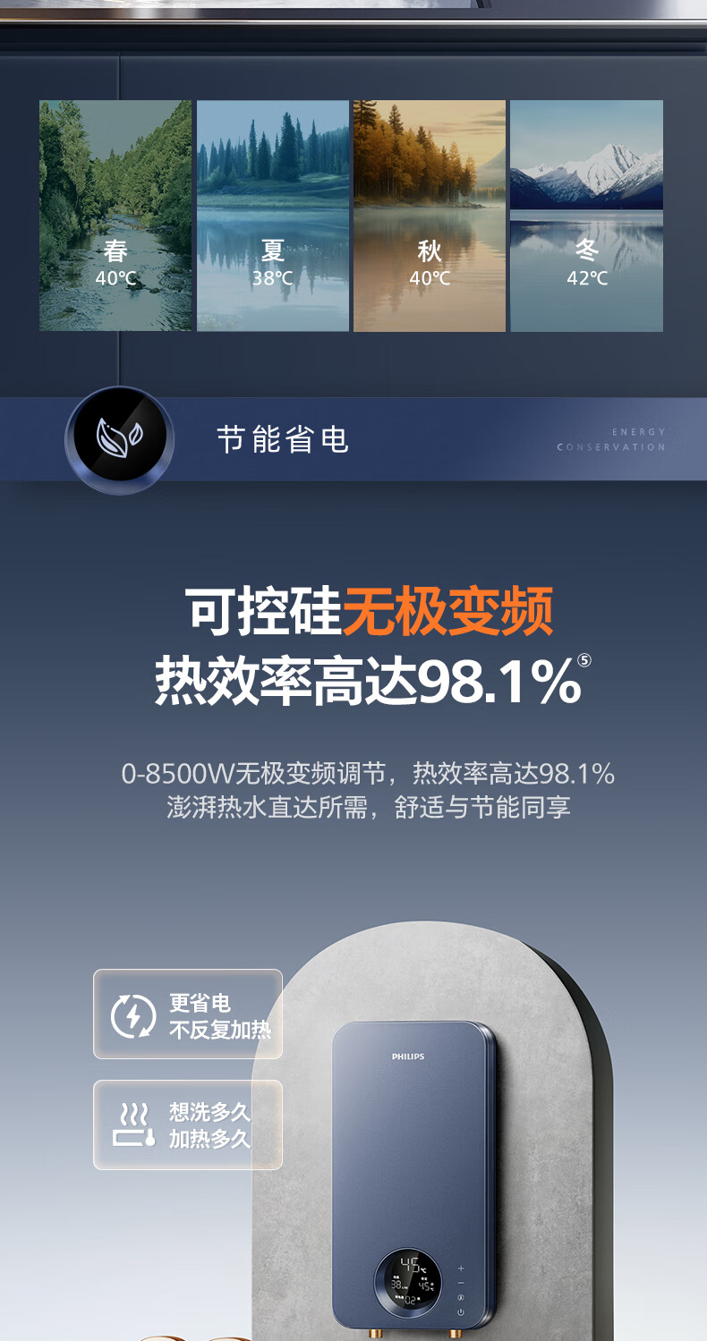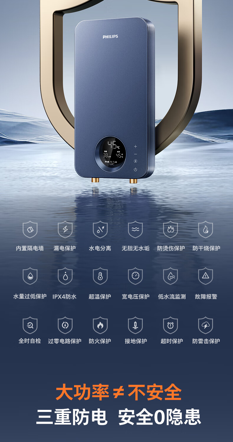 飞利浦(PHILIPS)即热式电热水器 电即热8500W速热无极变频智能恒温 无胆免储水AWH1028/93(85HB)