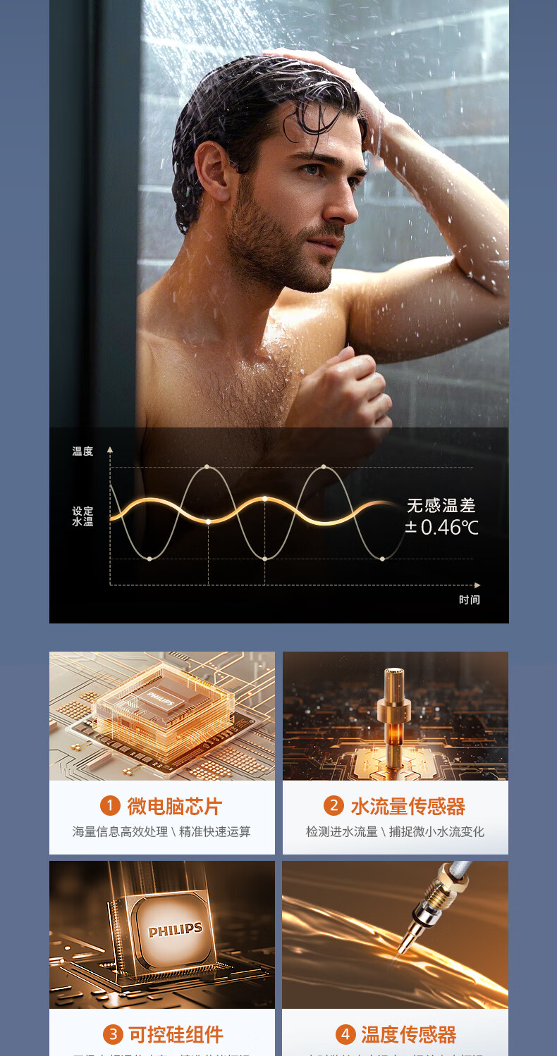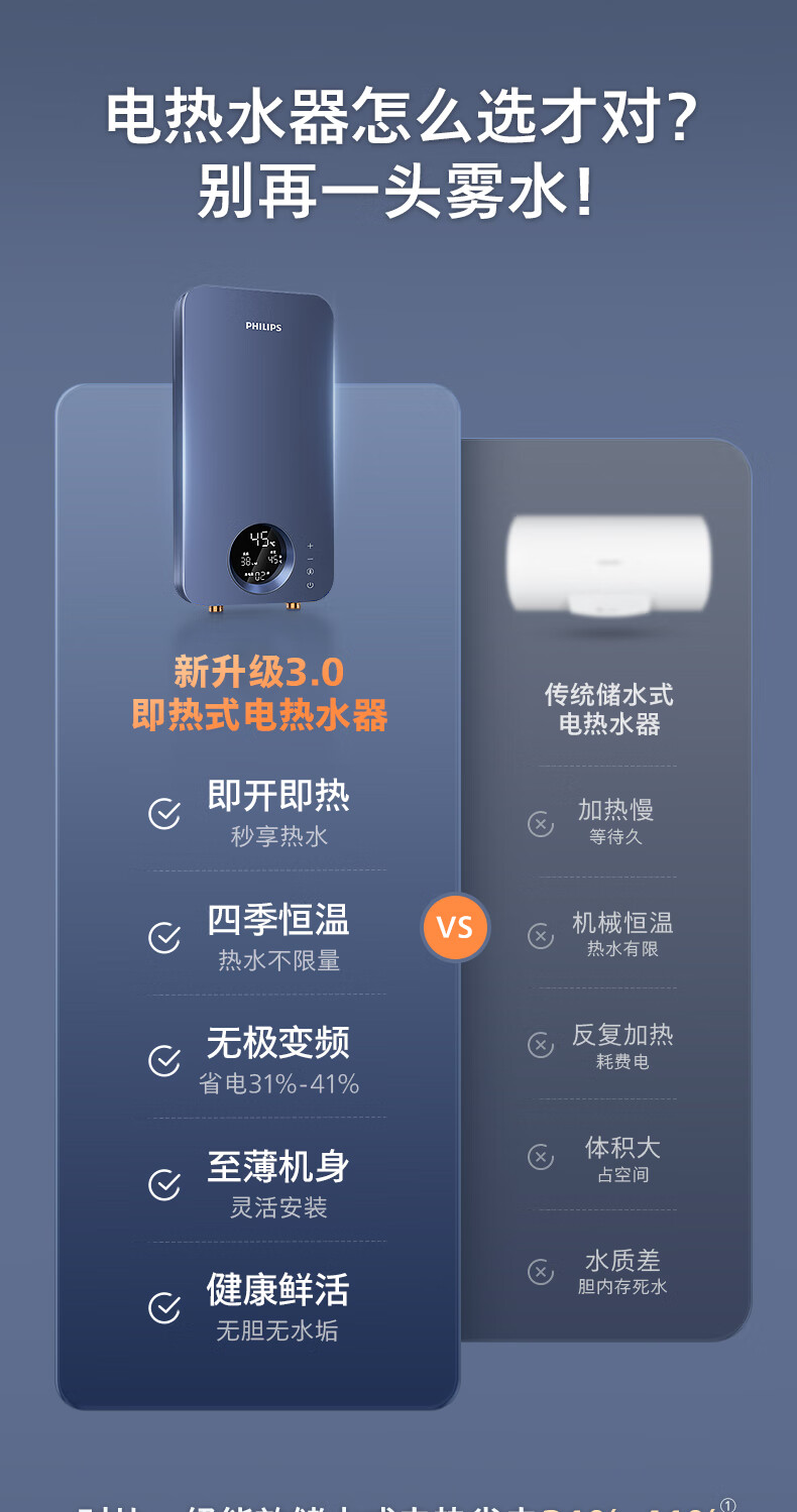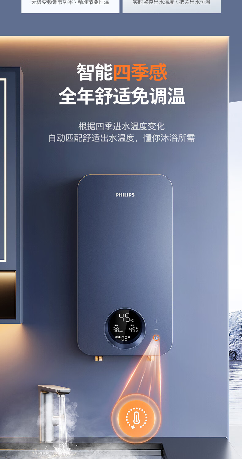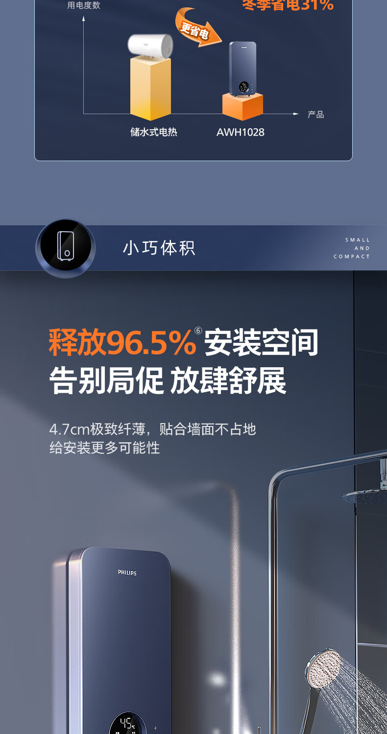 飞利浦(PHILIPS)即热式电热水器 电即热8500W速热无极变频智能恒温 无胆免储水AWH1028/93(85HB)