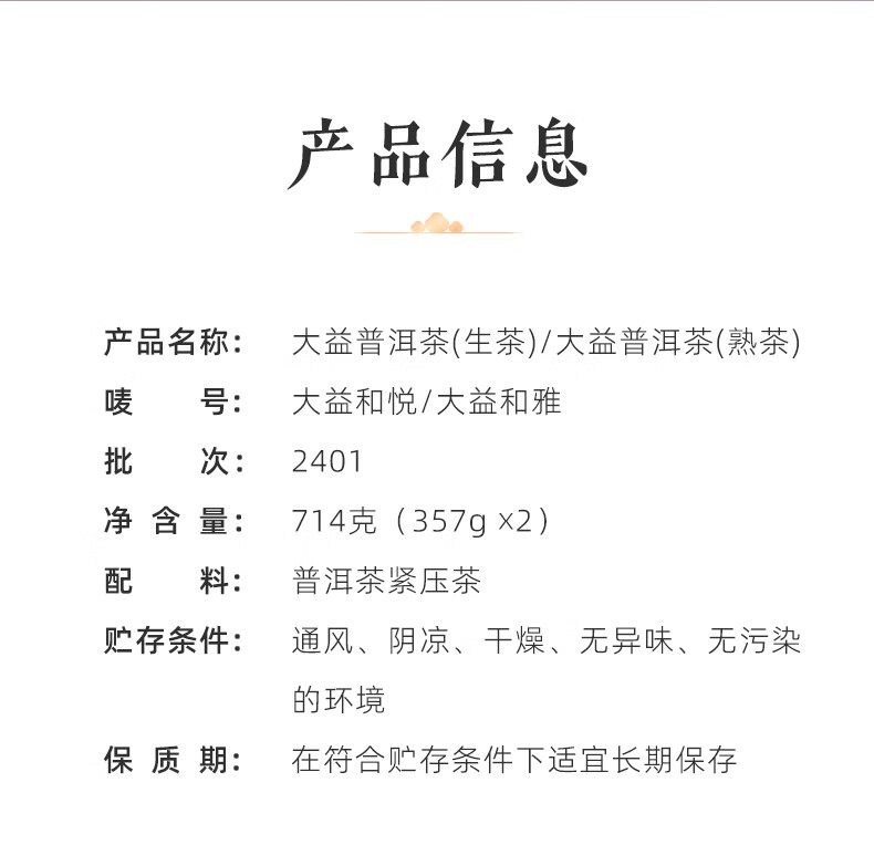 大益TAETEA茶叶普洱茶 和悦和雅生熟茶组合357g*2 抽拉式