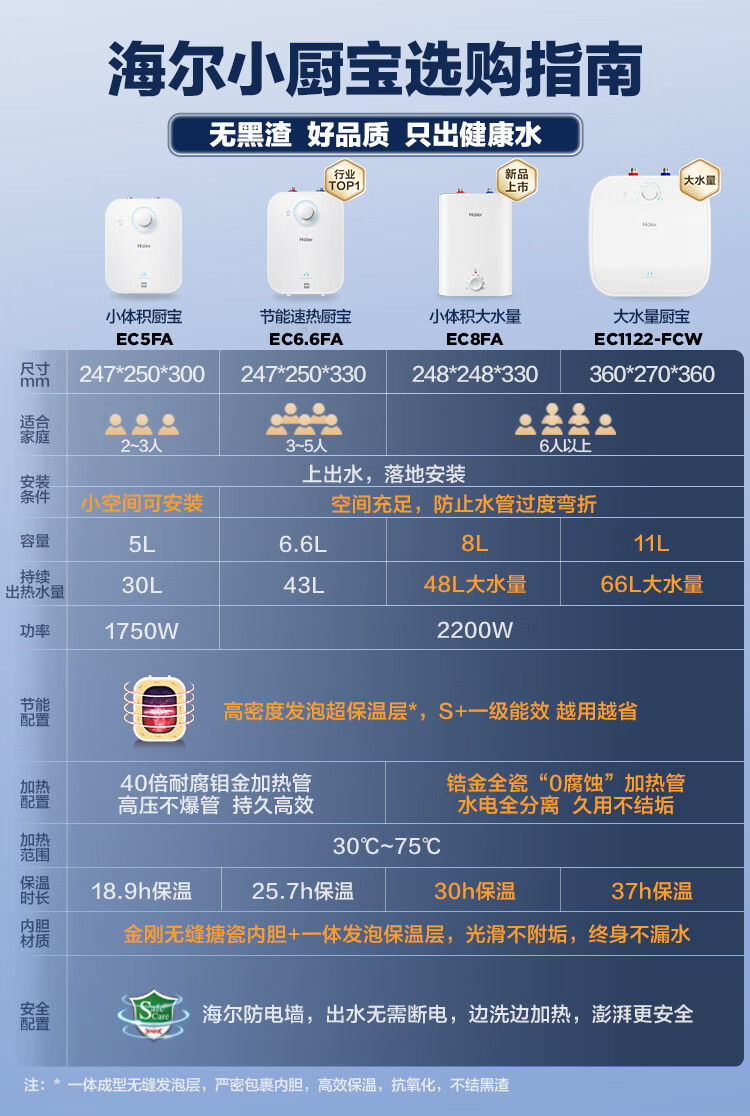 海尔(Haier)小厨宝电热水器 EC5FA好水质一级能效节能1750W速热家用储水式厨房台下小型安全热水宝