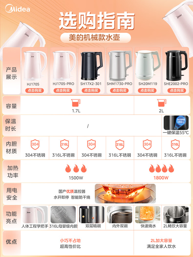 美的(Midea)电热水壶烧水壶自动断电长效保温一体恒温壶食品304不锈钢价保11.11 1500W快速加热1.5升 SH15X301