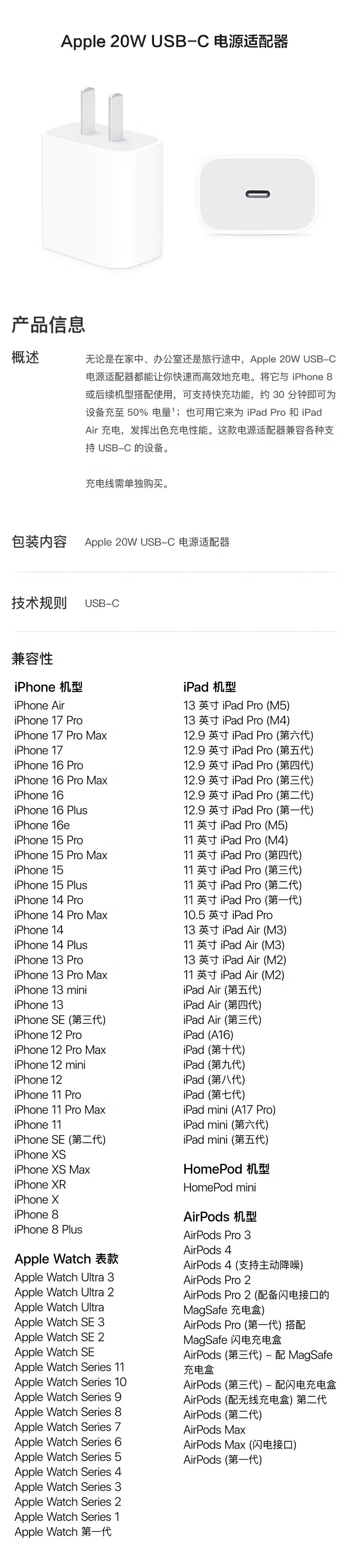 Apple/苹果 20W USB-C充电器 type-c充电器苹果手机充电器原装手机快充头 苹果17手机充电器
