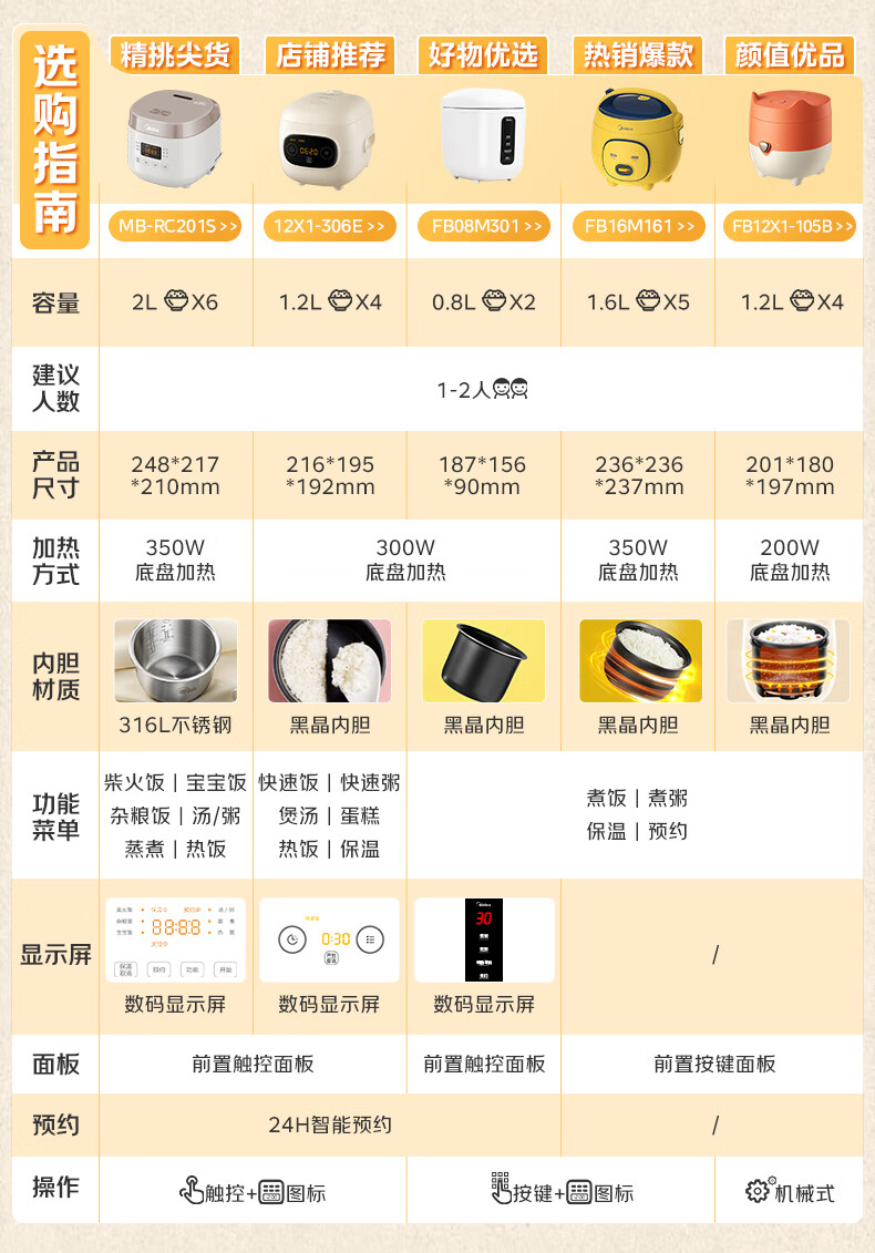美的(Midea)0涂层2L不锈钢内胆1-2人电饭煲电饭锅 家用智能多功能微压无涂层电饭煲MB-RC201S礼品团购
