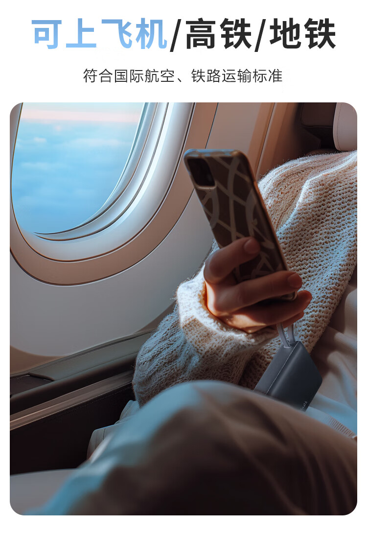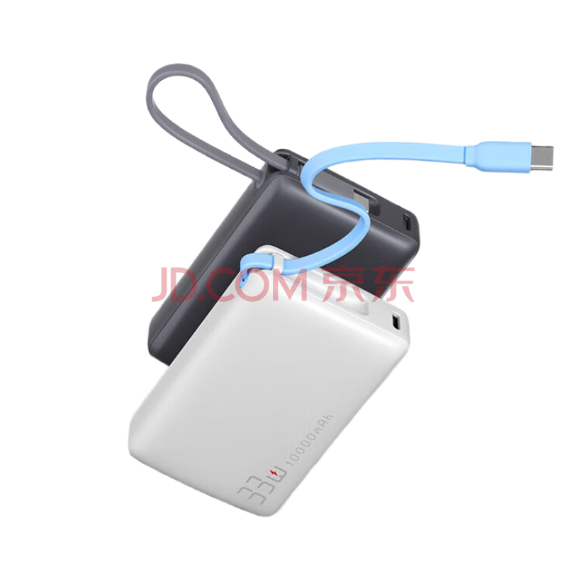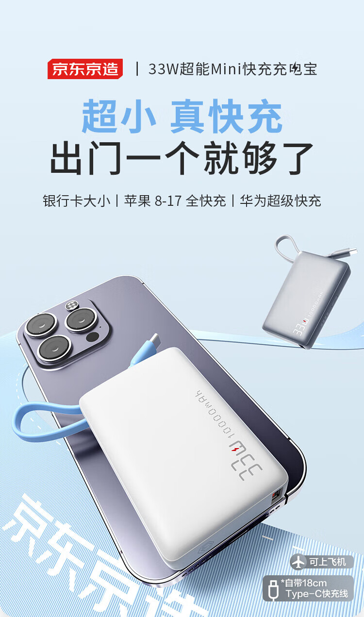 京造33W快充自带线钢壳电芯充电宝10000毫安时3c认证可上飞机移动电源小巧便携适用苹果17华为小米17