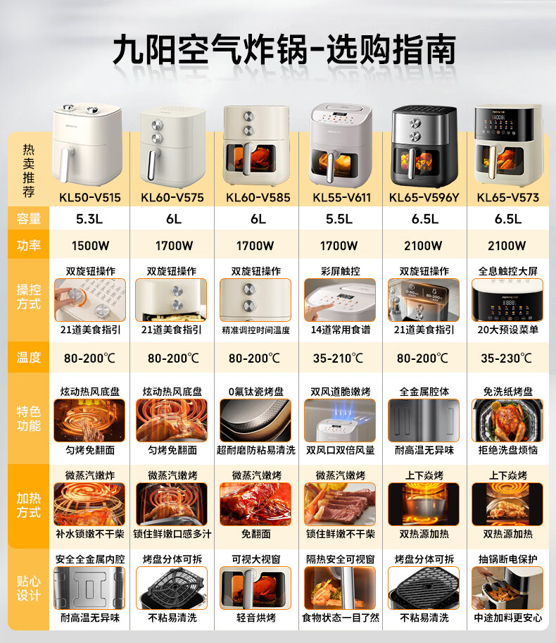 九阳(Joyoung)家用免翻面6L大容量 空气炸锅 蒸汽嫩烤蒸烤炸一体机 多功能电炸锅 金属内腔不粘锅 KL60-V575
