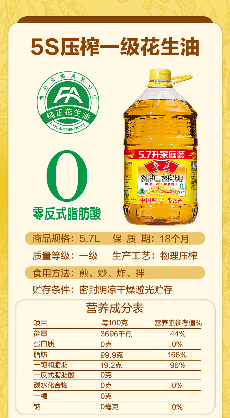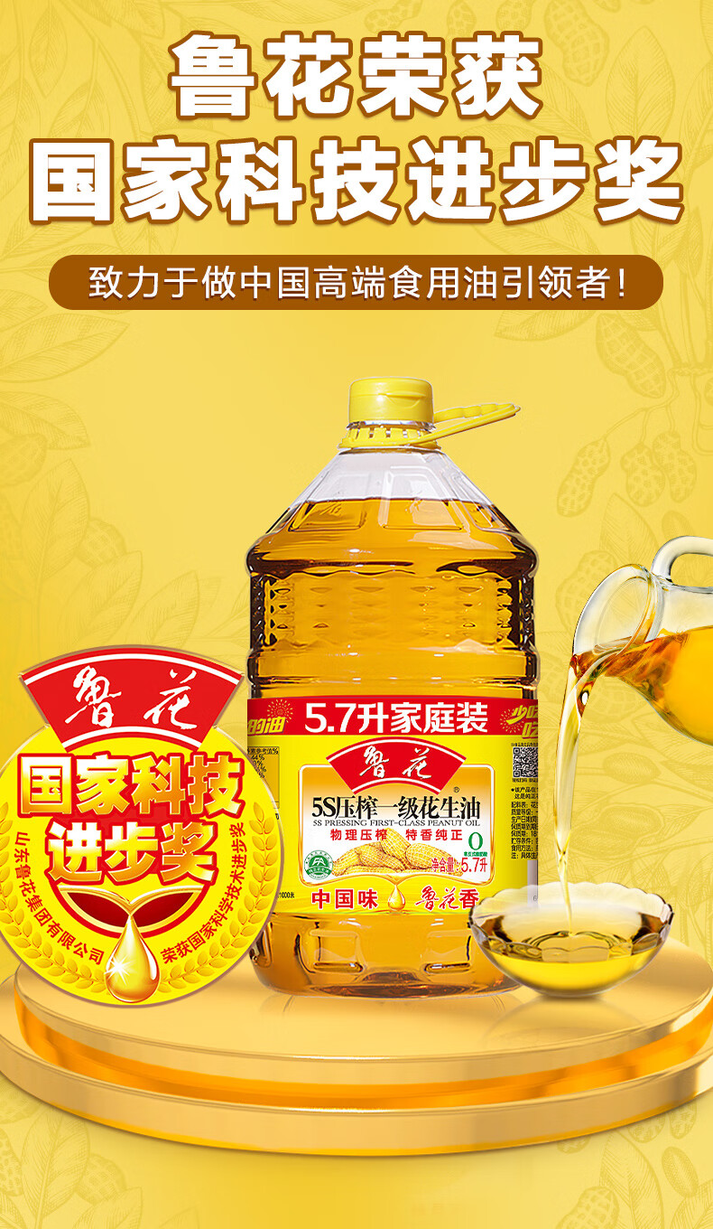 鲁花 【保真花生油】食用油 5S 物理压榨 压榨一级 花生油5.7L