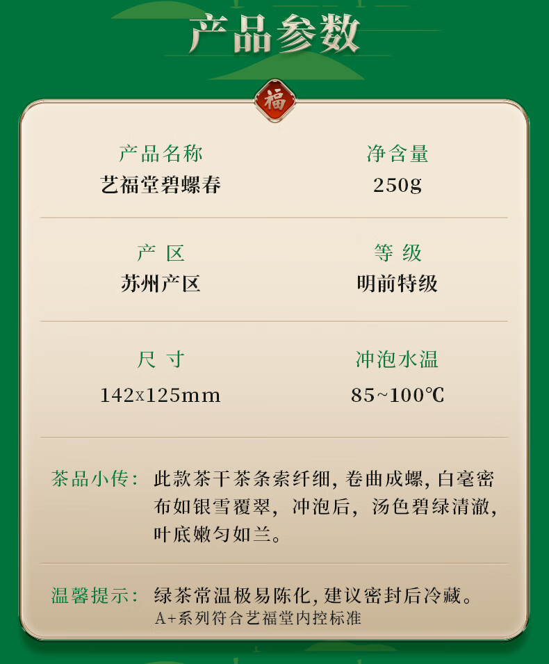 艺福堂绿茶【2026新茶】江苏明前碧螺春特级精品AA+高香250g罐装茶叶