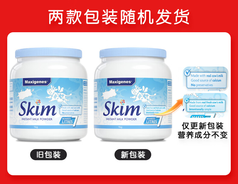 Maxigenes美可卓正品蓝妹子脱脂高钙牛奶粉儿童学生成人中老年1kg罐装