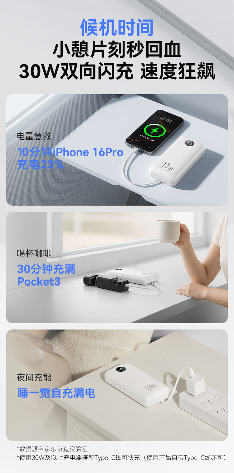 京造30W快充充电宝3c认证可上飞机自带线20000毫安大容量移动电源适用苹果17小米17华为荣耀