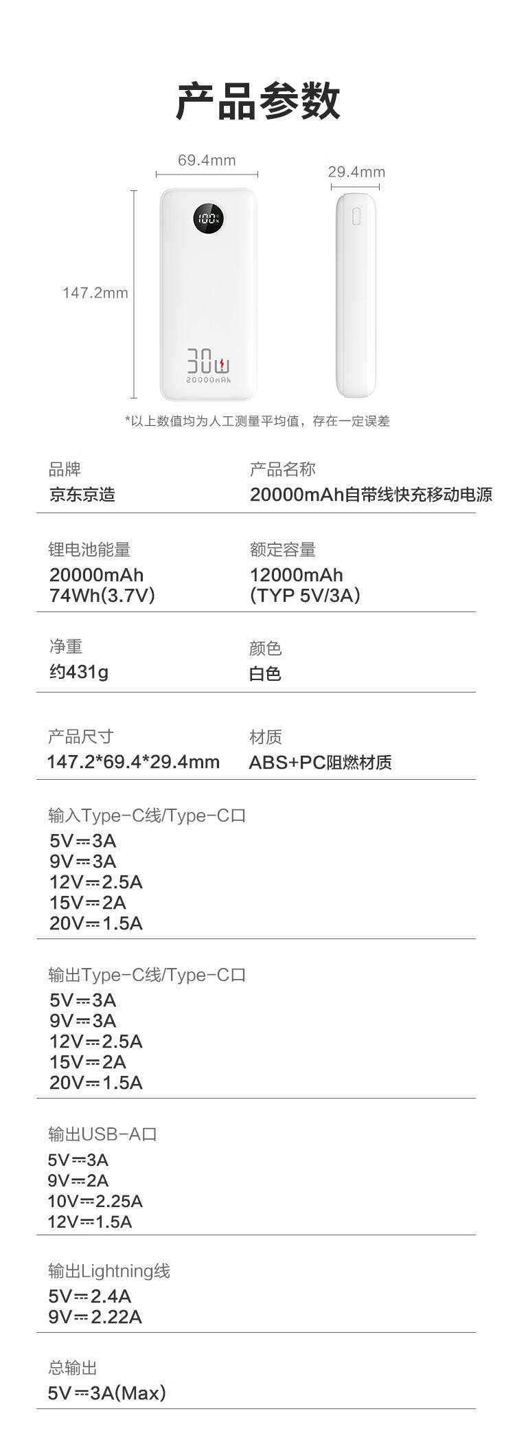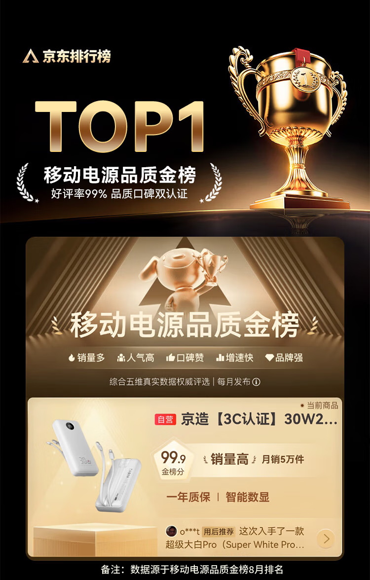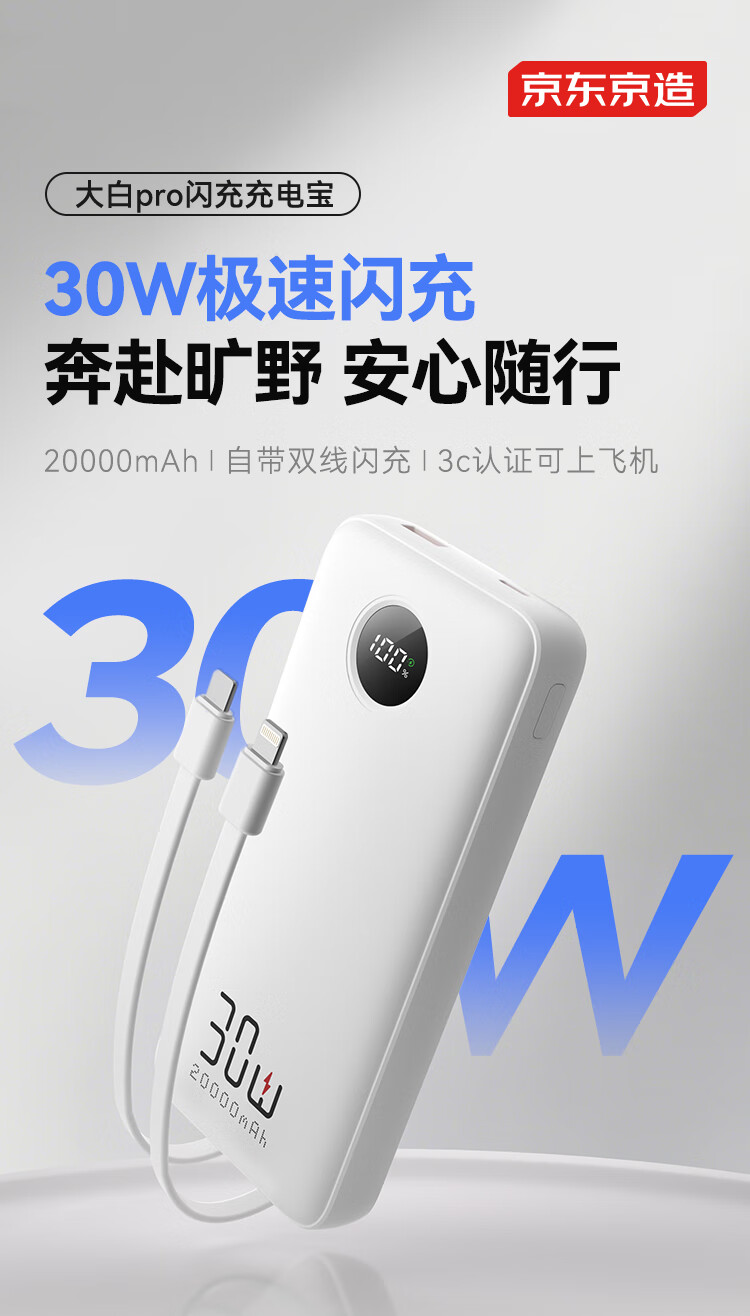京造30W快充充电宝3c认证可上飞机自带线20000毫安大容量