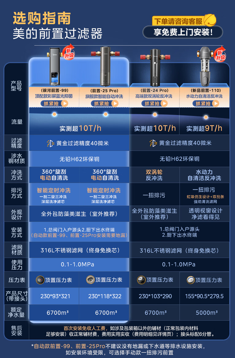 美的(Midea)前置过滤器9T/h大通量家用40微米反冲洗水驱动自动清洗滤网不锈钢免换芯全屋净水器QZBW20S-110