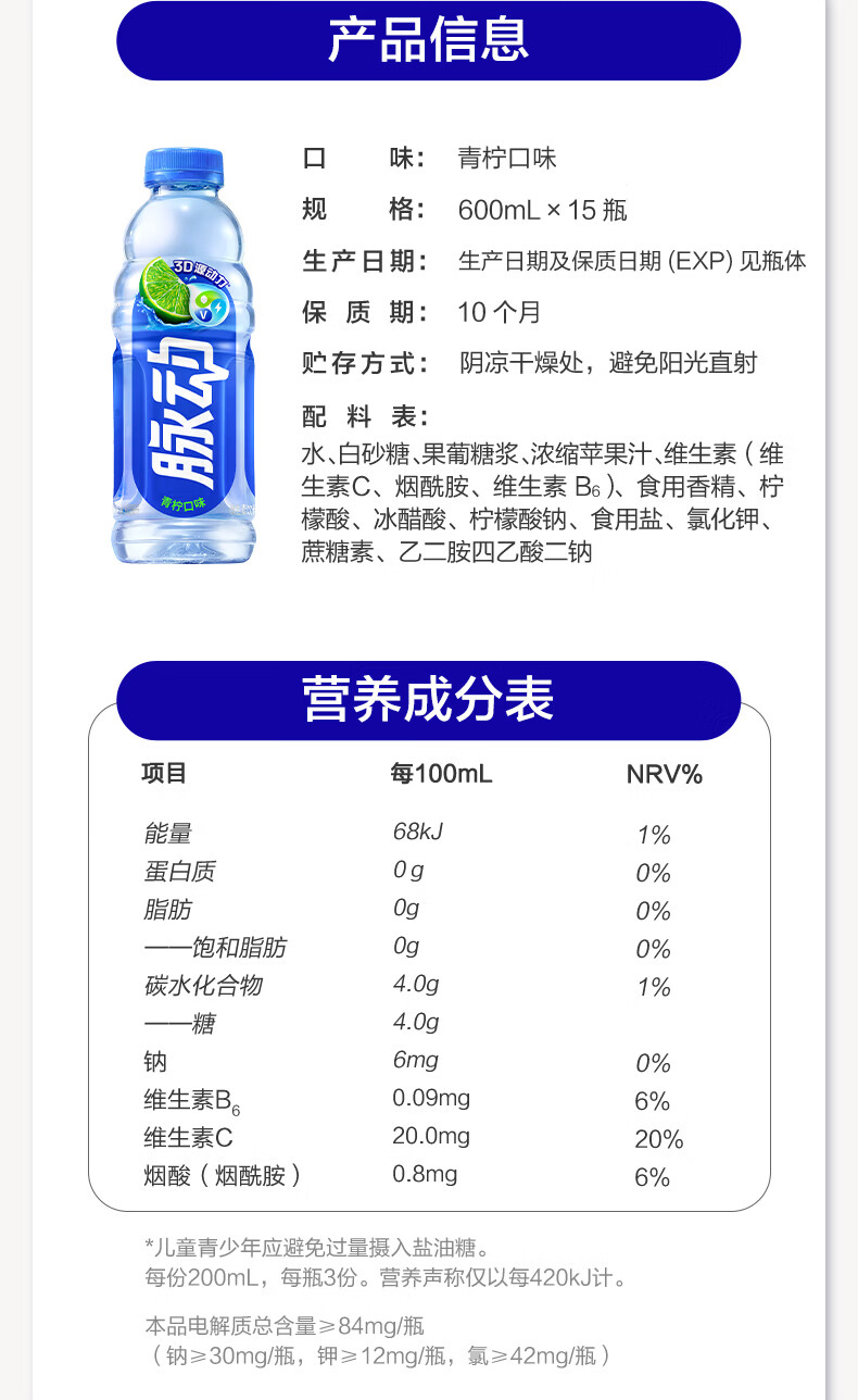 脉动青柠口味600ML*15瓶低糖维生素C电解质水运动功能饮料年货整箱装