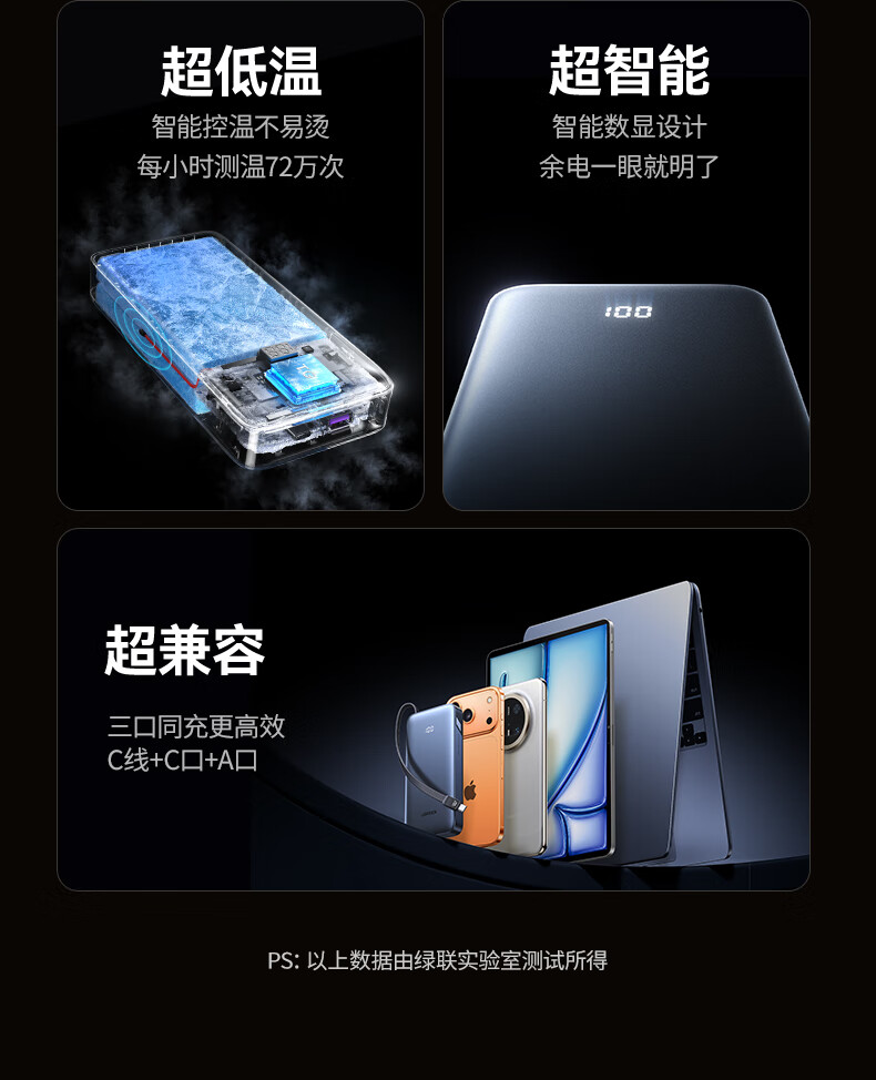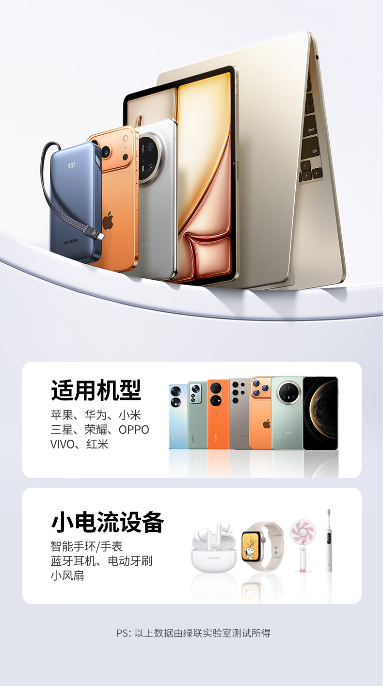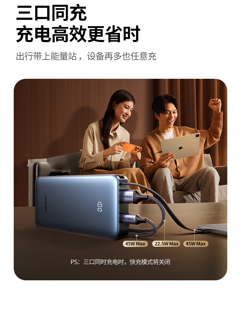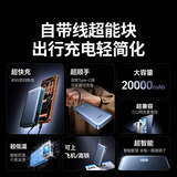 绿联【3C认证可上飞机】超能块充电宝自带线20000毫安45W快