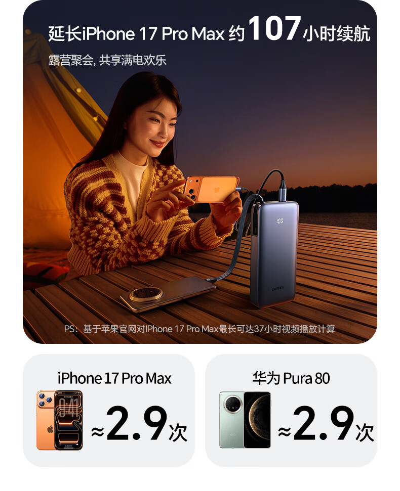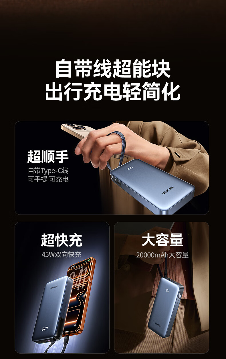 绿联【3C认证可上飞机】超能块充电宝自带线20000毫安45W快充 大容量移动电源适用苹果iPhone17/16小米