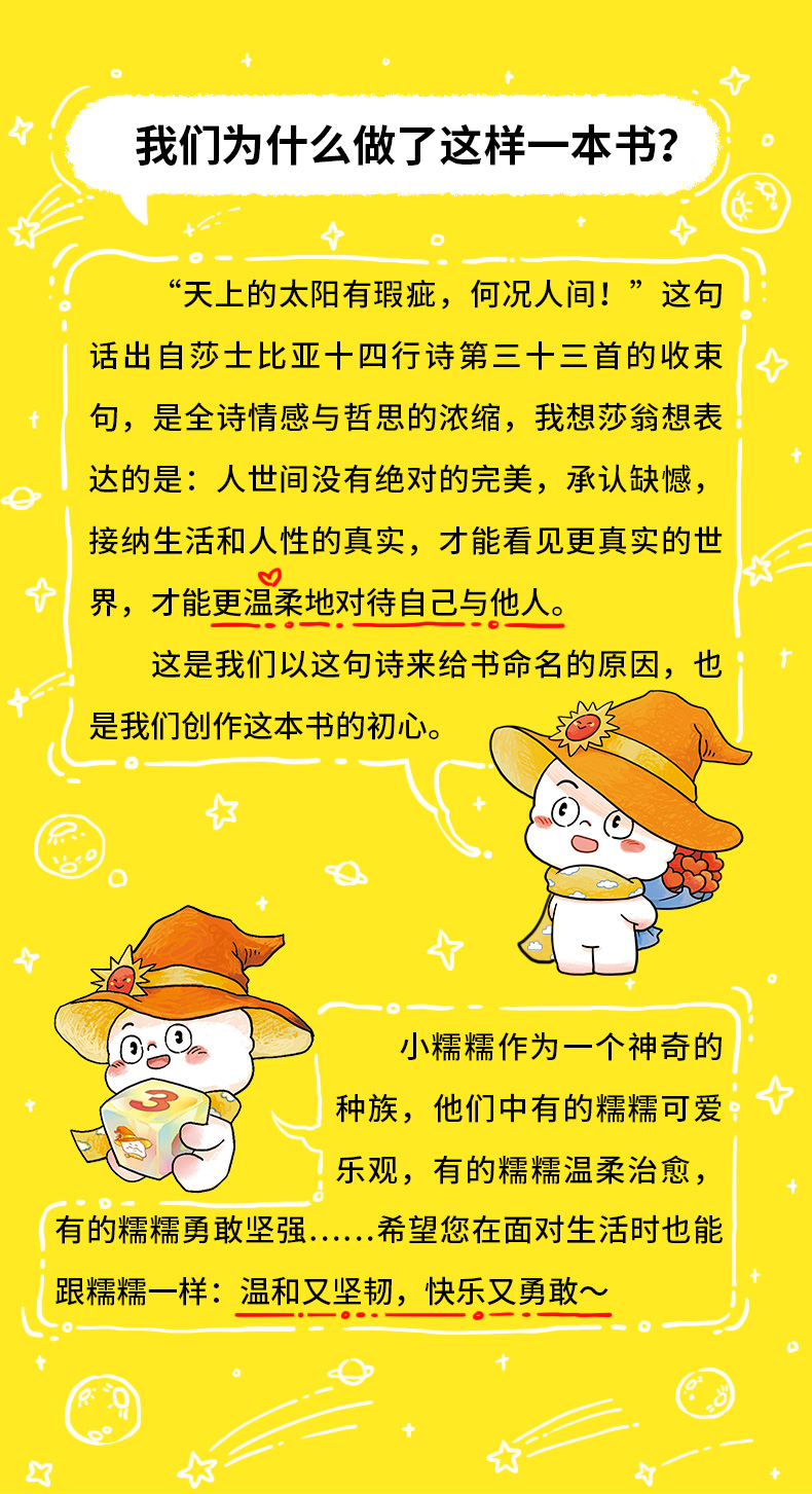 3.绘图创意:围绕“一颗会呼吸的星球——糯糯星球,太阳魔法师糯糯米通过收集魔法泡泡的旅程”绘制的轻松解压的“铅笔画风”;让读者通过“生活名言”的轻阅读和“掷骰子”来释放生活中的压力,激活愉悦、享受、满足和爱等幸福感。