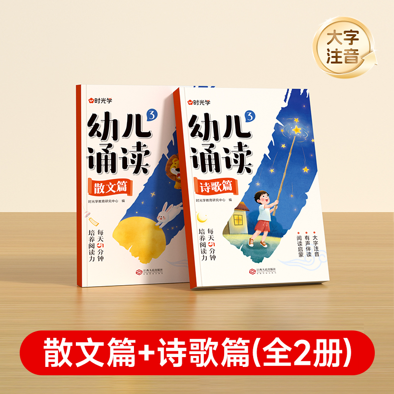 《幼儿诵读3(全2册)》是一套专为3一6岁学前儿童打造的语言启蒙读物,旨在通过优美动听的诗歌和浅显易懂的散文,带领孩子走进语言的奇妙世界。书中精选节奏明快、朗朗上口的童诗和短小精炼的散文片段,文字清新活泼,充满童趣,让孩子在诵读中感受韵律之美,培养语感,提升语言表达能力。本书特别注重幼儿的识字启蒙,精选贴近生活的常用汉字,结合生动有趣的插图,帮助孩子在轻松愉快的氛围中自然认字,积累词汇量。同时,书中内容贴近儿童认知水平,既能激发他们的阅读兴趣,又能培养他们良好的阅读习惯。
