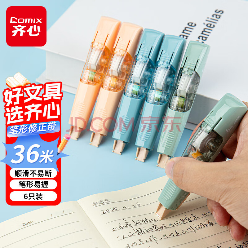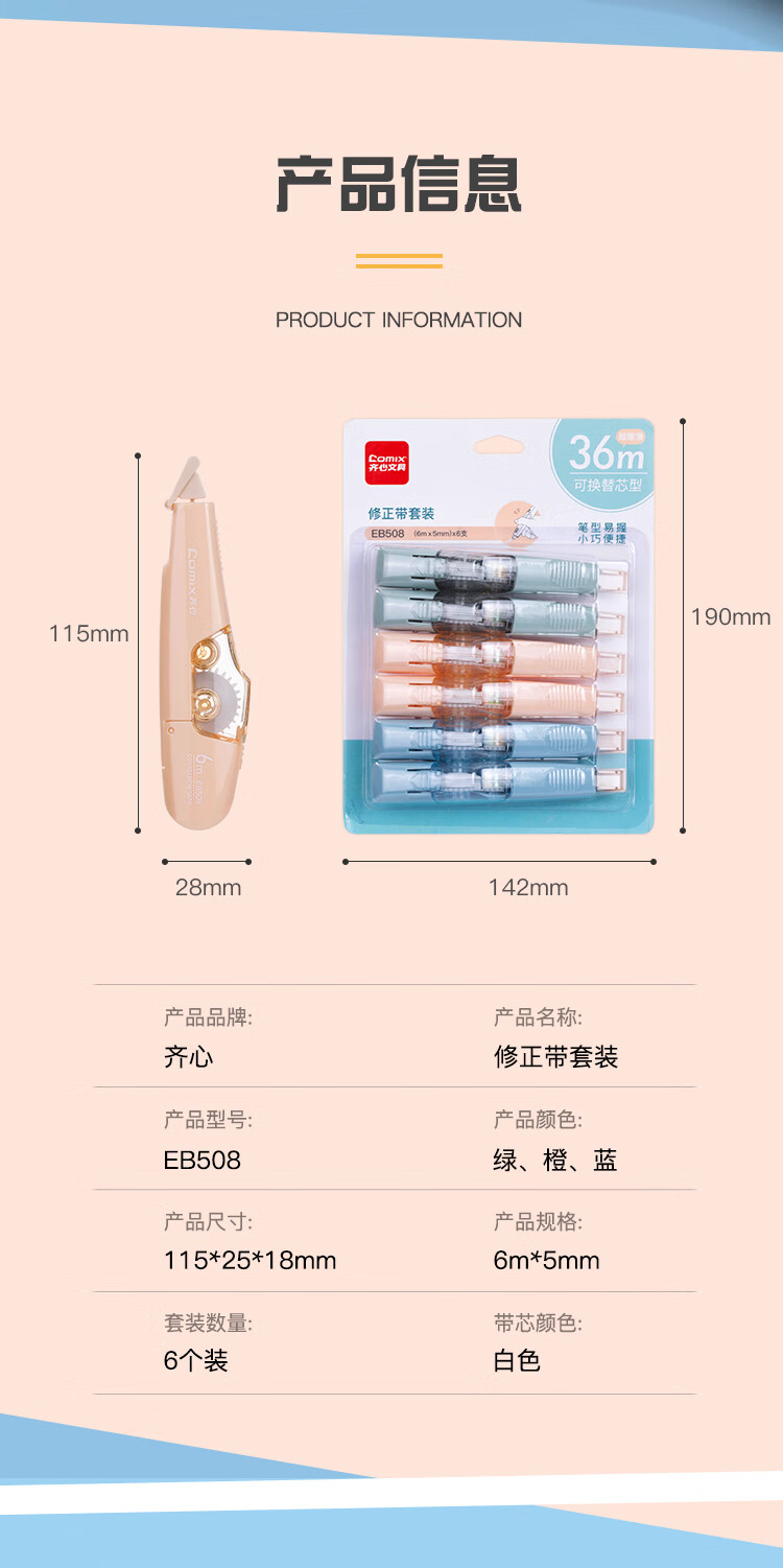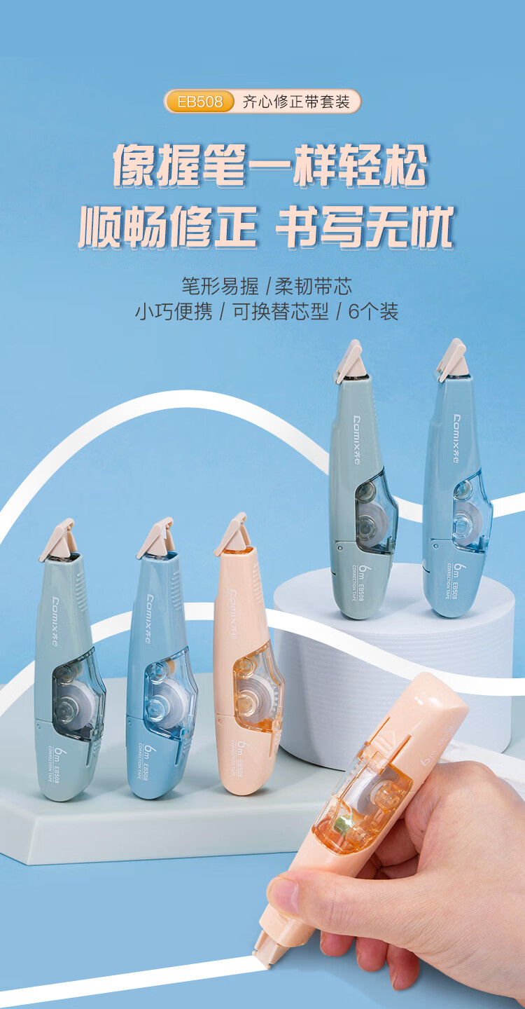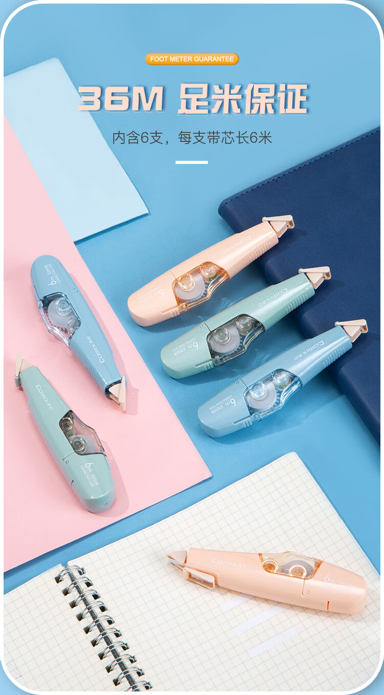 齐心(COMIX)36m笔型修正带6只装 大容量可换替芯便携高颜值 学生开学文具用品涂改带改正带正带EB508