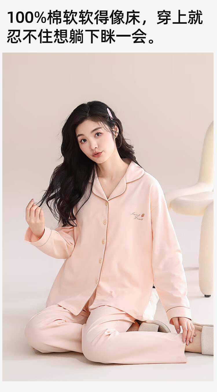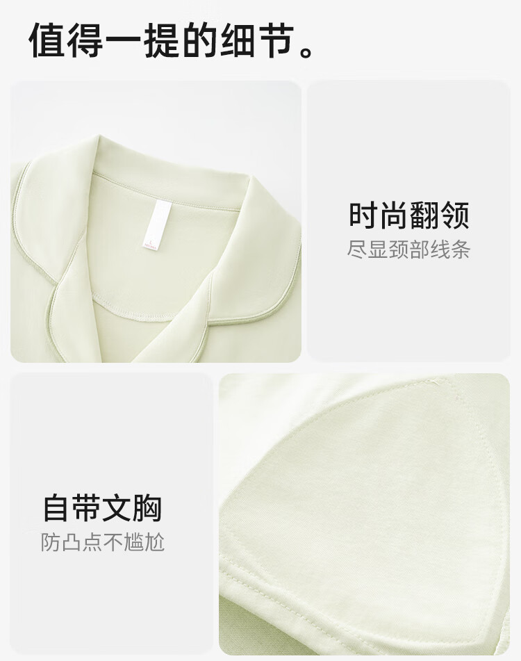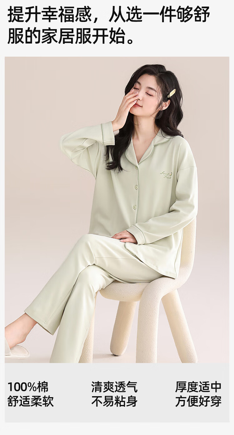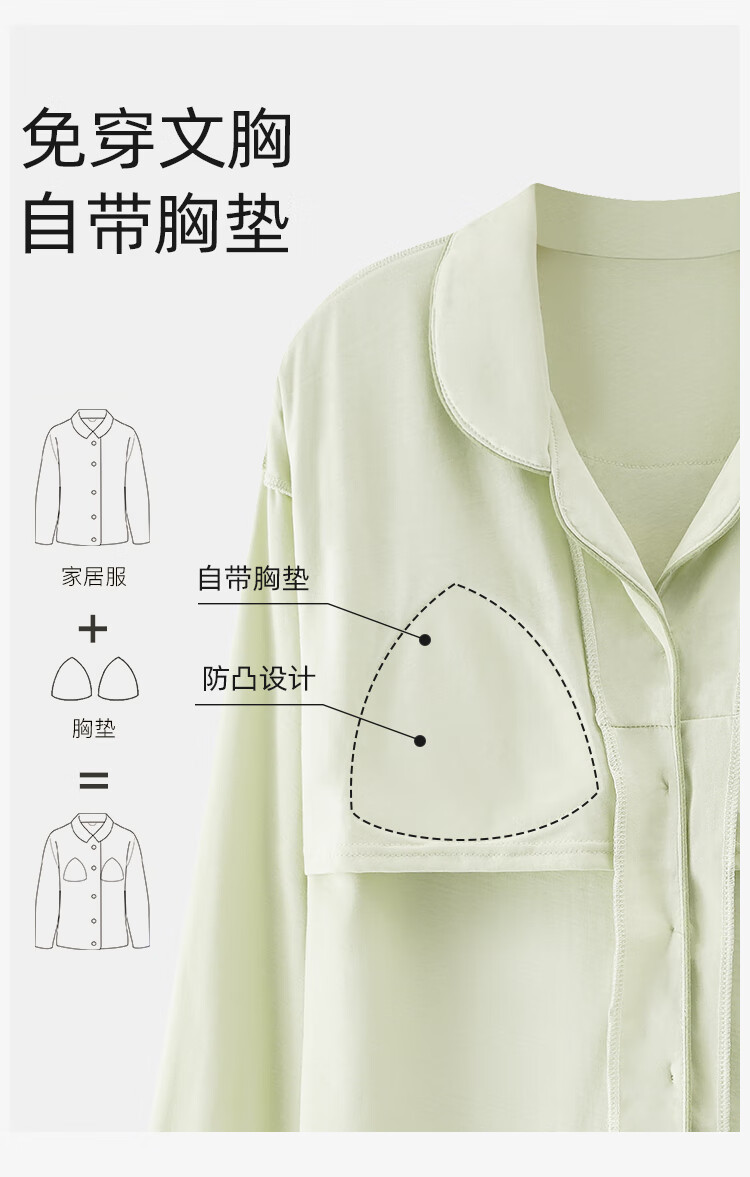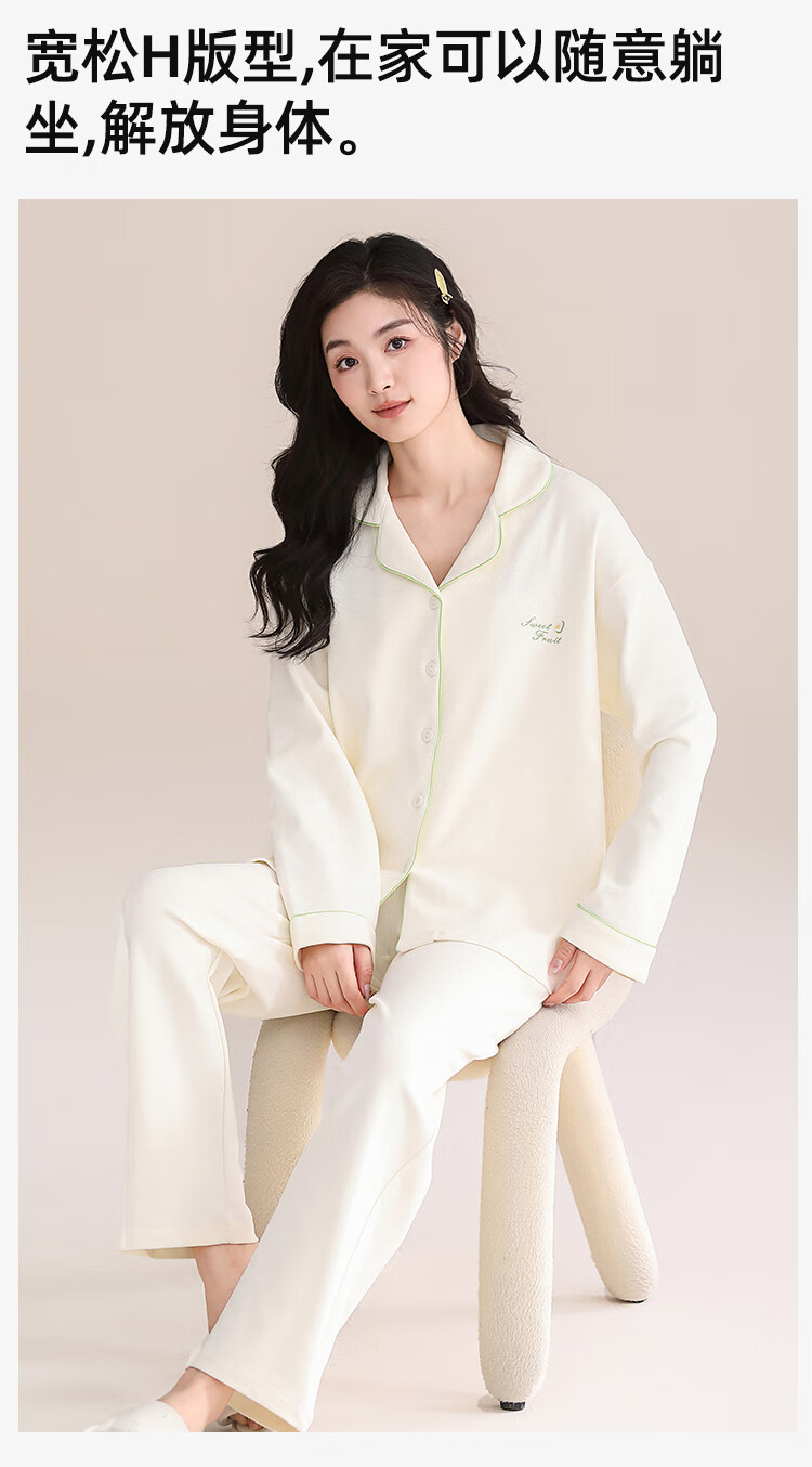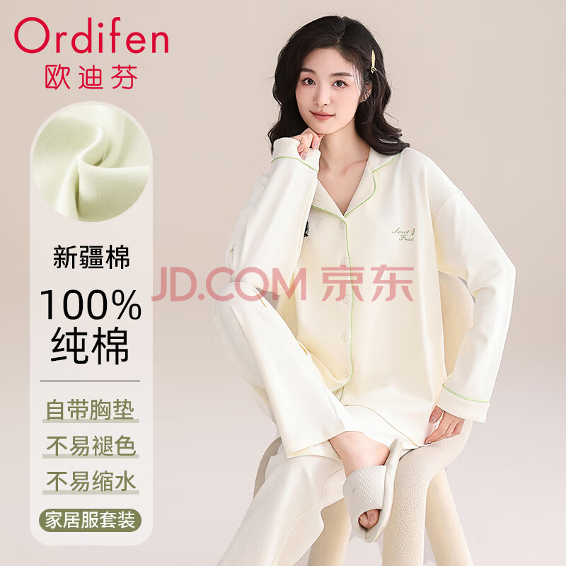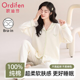 欧迪芬100%棉带胸垫女士睡衣女纯棉长袖免穿文胸可外穿家居服套装米白L