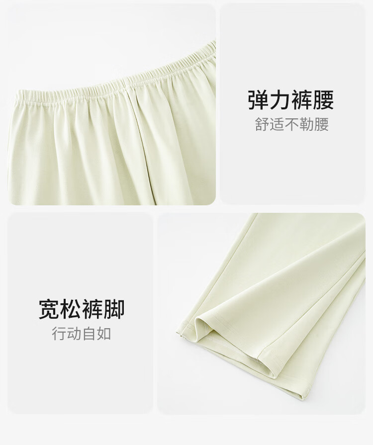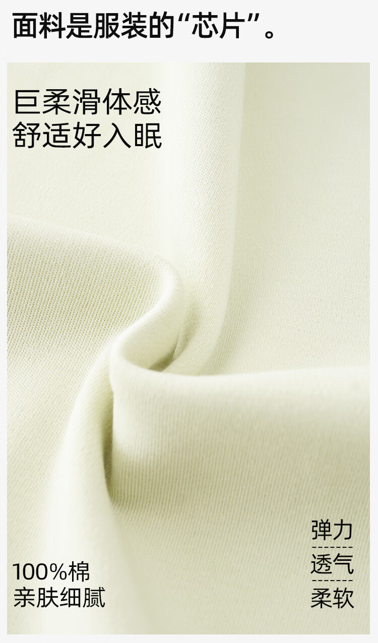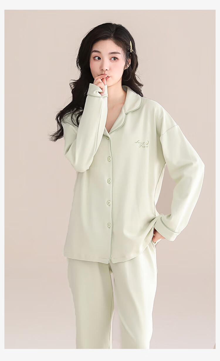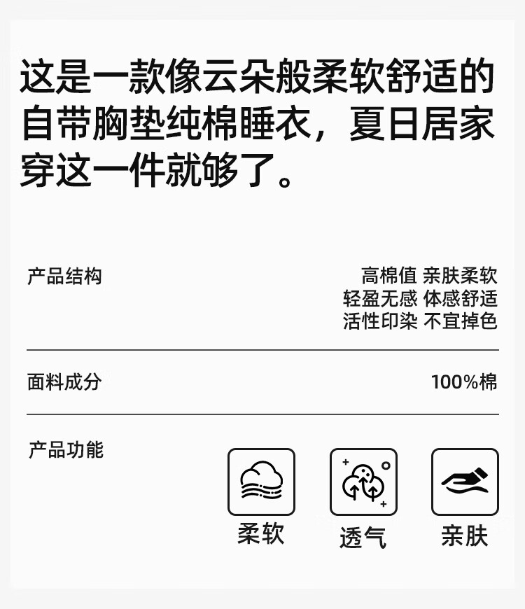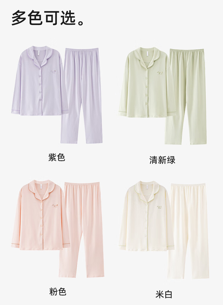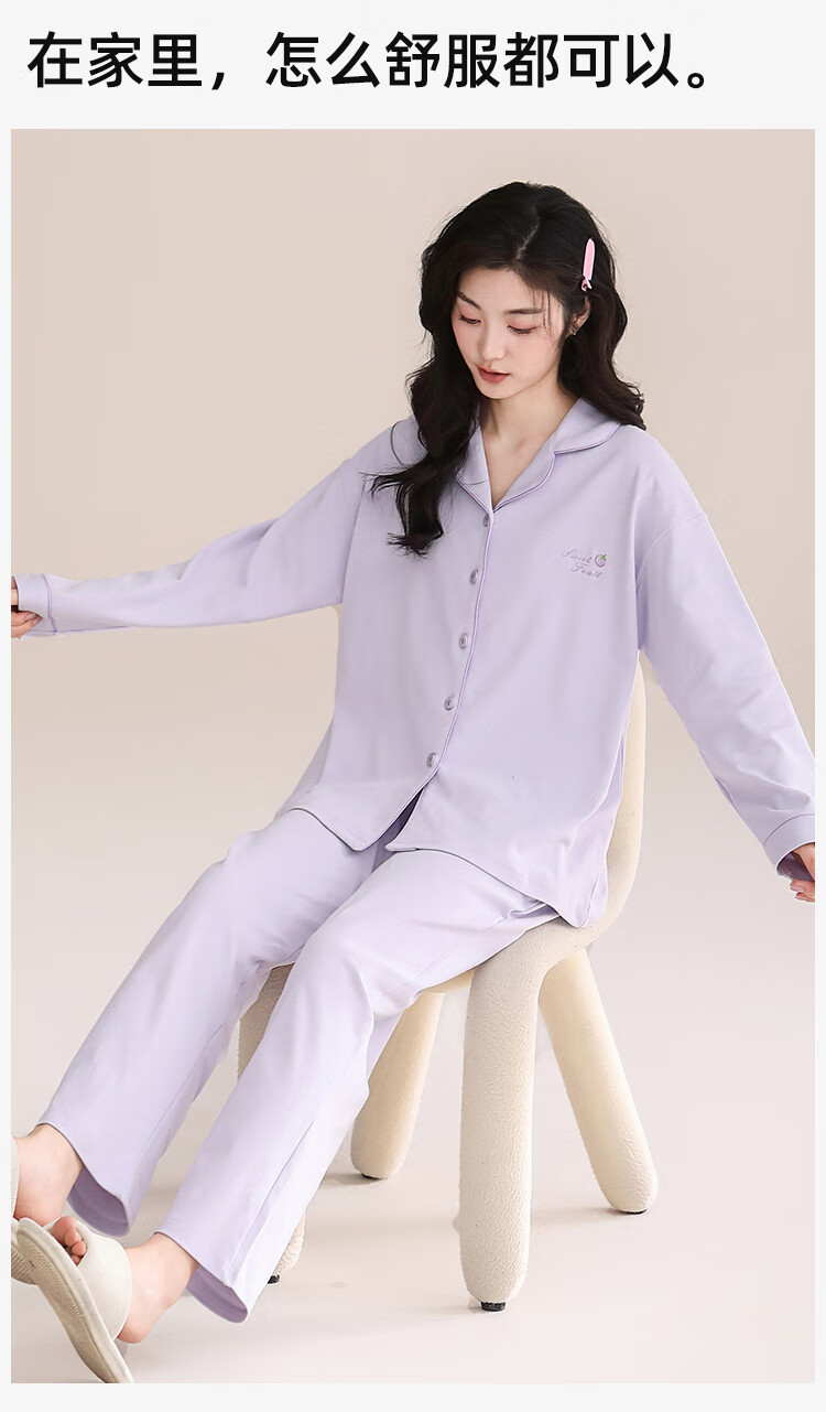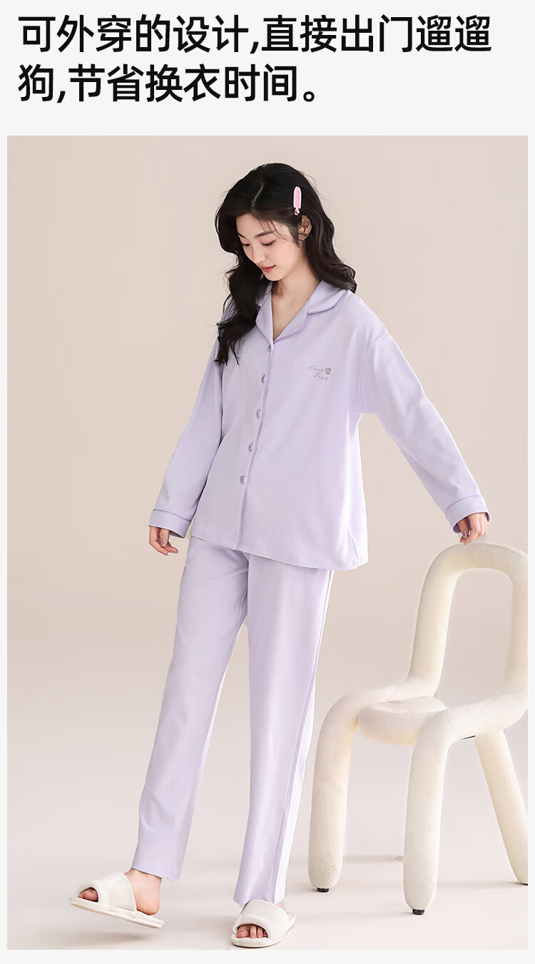 欧迪芬100%棉带胸垫女士睡衣女纯棉长袖免穿文胸可外穿家居服套装米白L