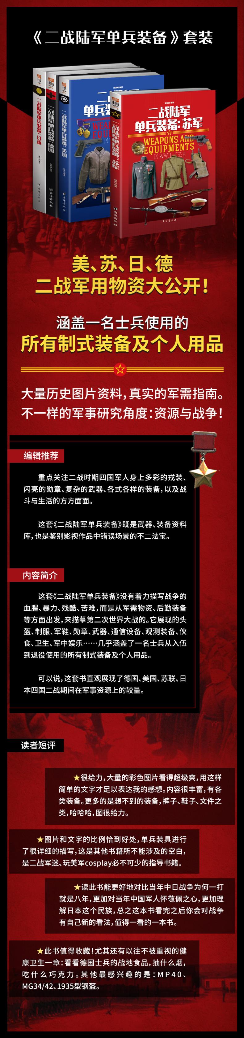 这套《二战陆军单兵装备》没有着力描写战争的血腥、暴力、残酷、苦难,而是从军需物资、后勤装备等方面出发,来描摹第二次世界大战的。它展现的头盔、制服、军鞋、勋章、武器、通信设备、观测装备、伙食、卫生、军中娱乐……几乎涵盖了一名士兵从入伍到退役使用的所有制式装备及个人用品。