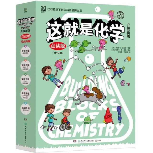 1.巴菲特公司旗下百年科普品牌出品,小学生人手一套! 2.化学启蒙黄金参考书!通过轻松易读的漫画形式介绍了10大化学主题,既给孩子们普及了基本的化学知识,又介绍了核化学等前沿科技,培养孩子们观察生活和对化学的兴趣。 3.点读升级。全套图书共3000+处点读,图文均可点读,其中化学方程式也制作了点读效果,这样孩子们不仅会写,还会读。封底扫描二维码,即可收听10个故事音频,质感高级,像是在看儿童剧一样精彩。 4.知识升级。邀请清华大学化学系博士,依据孩子们的接受水平,撰写了30个延伸知识点,比如光学显微镜是什么、元素的中文名称也有规律、元素符号从哪里来?……孩子们可以通过音频或点读的方式获得。 5.实验升级。全书共涉及11个化学实验。在“科学探索”版块中,原子带领小朋友们尝试简单的化学实验,在实验中让孩子们更进一步地了解现象背后的原因。 6.内容升级。全书共100+个化学知识点,贴合新课标,涵盖课本核心内容,可以让孩子面对中学教材时也毫不陌生。 7.互动升级。在文中设置了近40个互动,孩子们可以带着问题读故事;故事结束后,有40道题目“考考你”,进一步让小朋友巩固重点知识点。还设置了70+个词汇解释,辅助孩子们理解内容。 8.清华大学化学系博士全文审订并倾情推荐,安徽大学博士生导师倾情推荐。