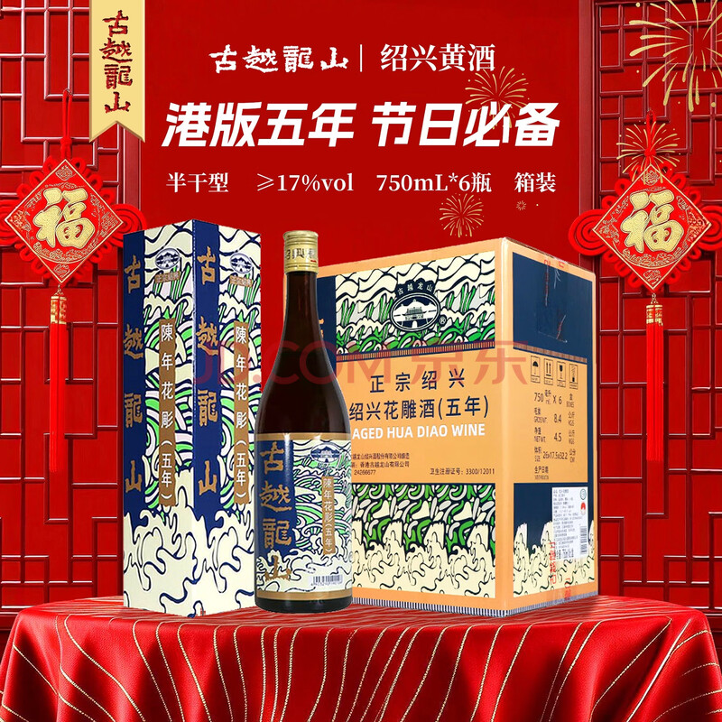 古越龙山港版花雕五年 半干型 绍兴黄酒 750ml*6瓶 整箱装 送礼