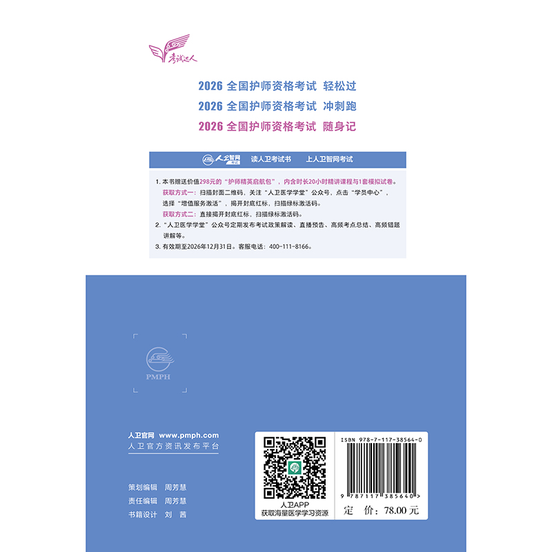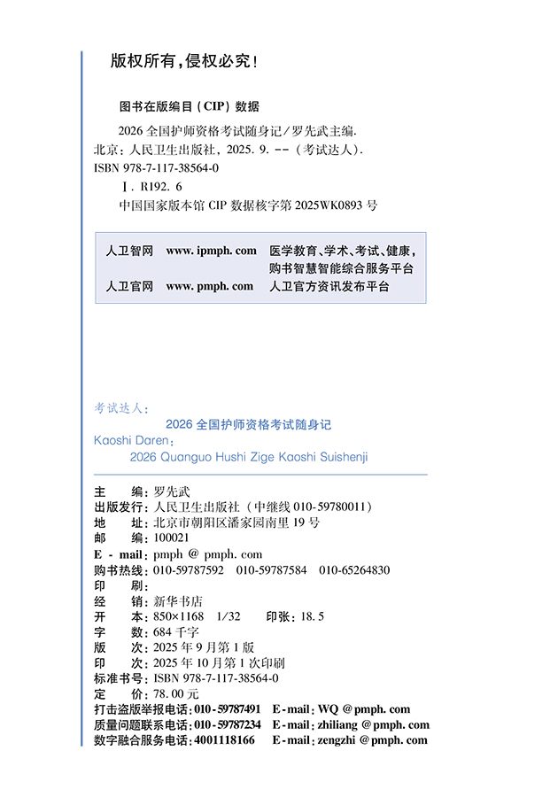 “考试达人”系列经过十余年的打磨,已经形成了独特的品牌和较好的市场影响力。 《轻松过》适用于基础阶段复习。栏目包括:①“考点导航”,根据最新版“考试大纲”给考生指出复习重点;②“温馨提示”,帮助考生掌握记忆技巧;③“例题解析”,提供经典考题讲解解题思路;④“考点练习”,帮助考生检验复习效果。 《冲刺跑》适用于冲刺阶段复习,内含“冲刺宝典”、12套“冲刺卷”及1200道真题视频讲解。“冲刺宝典”是高频考点大集合,确保重点内容不丢分;“冲刺卷”参照实际考试科目、题型、题量设计原则与命题趋势进行组卷,适用于冲刺阶段自测。 《随身记》高度凝练考点,一般以1~2句话总结考点精髓,编成助记口诀,包括口诀速记、试题巧记,方便考生利用碎片时间复习记忆,随时随地随身记。2026年版进行了全面改版。 《试题金典》以考试大纲为主线,采取“习题+答案+解析+过关点睛+考点分析”的结构,选取针对护师考试的有代表性的题目,考点覆盖全面,题型、难度均接近真实考试,适用于范复习时间少、以刷题巩固考点的考生。
