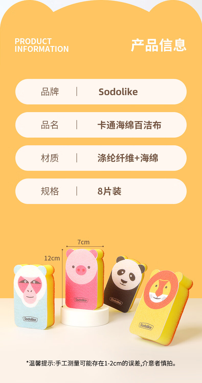 Sodolike尚岛卡通洗碗海绵8片抗菌净味海绵百洁布洗碗布抹布