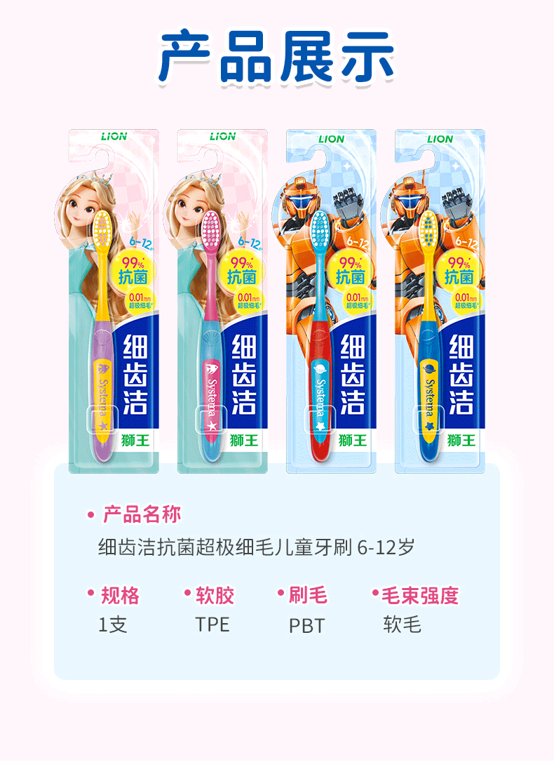 狮王(Lion)细齿洁抗菌细毛儿童牙刷减压预防蛀牙6-12岁太空版1支 颜色随机