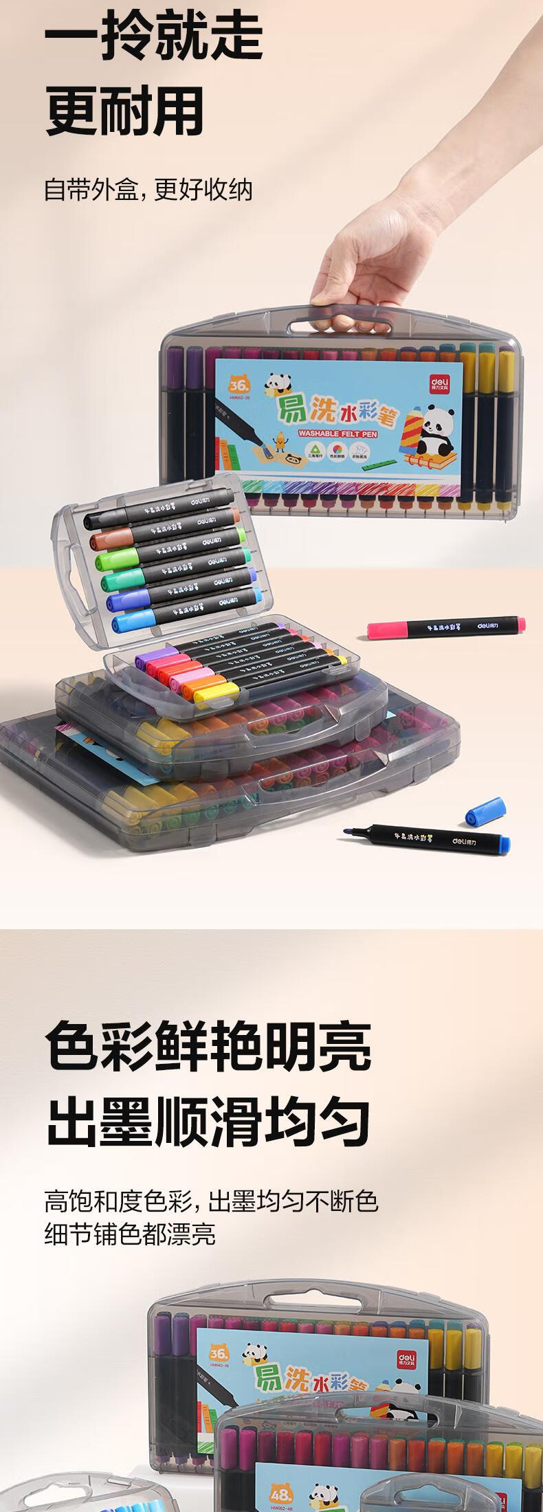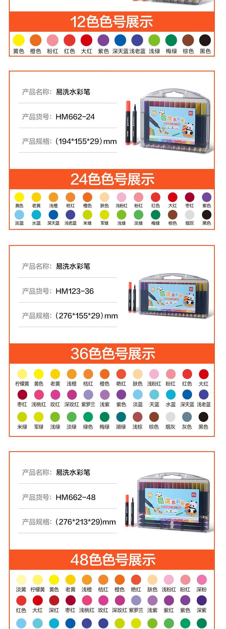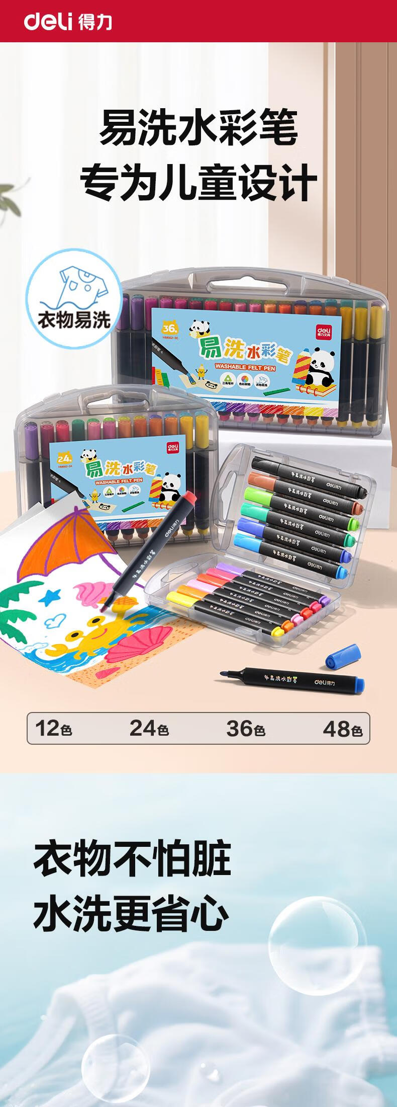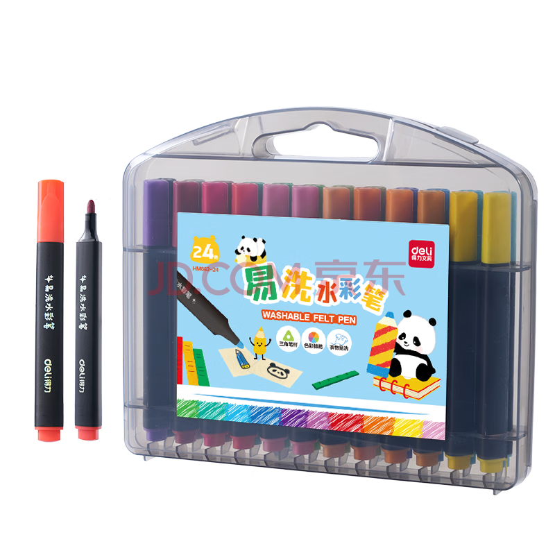 得力(deli)24色小黑盒易洗易清洗水彩笔熊猫粗三角杆学生儿童画画涂色美术绘画礼物HM662-24热门商品