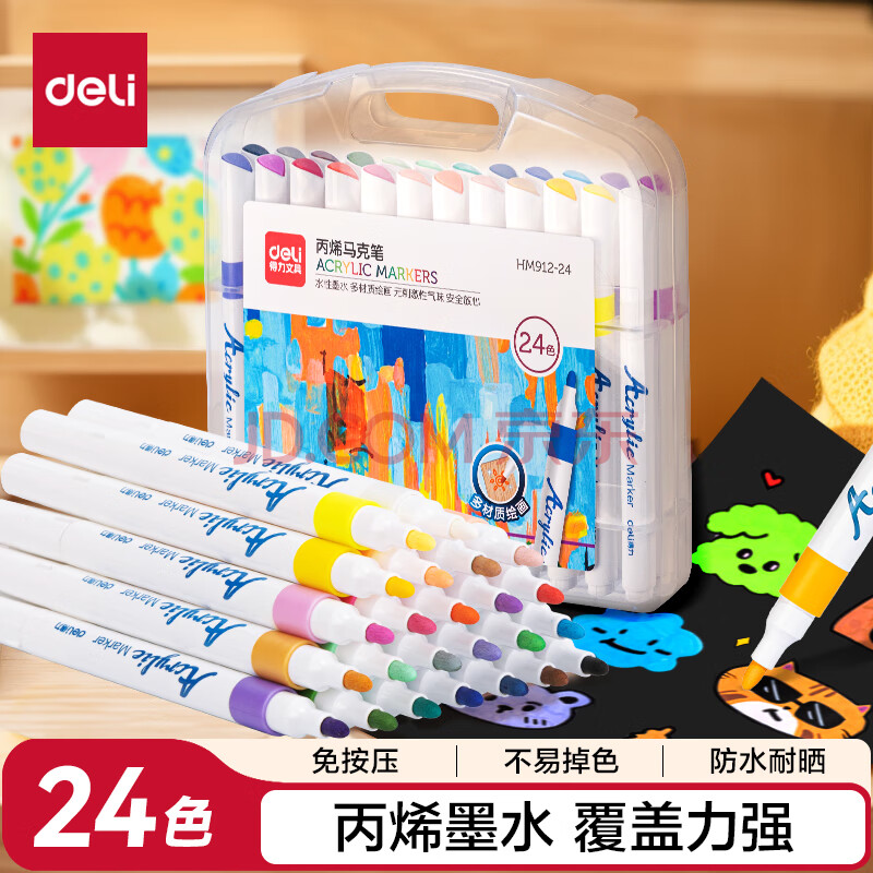 得力(deli)24色儿童学生水性丙烯马克笔PP盒装水彩笔生日礼物防水手绘咕卡荧光记号笔涂鸦美育