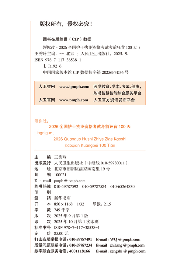 全书以《2026全国护士执业资格考试指导》为蓝本,紧密围绕最新考试大纲编写。每章分为“考情分析”“核心考点”两个模块。“考情分析”模块明确每章重要考点,分析各考点在近几年考题中的考查比例,为考生提示重点难点。“核心考点”模块提炼重要高频考点,并配有丰富的应试口诀及典型试题,帮助考生花最少的时间突破护考难关,顺利过关。本书为满足考生临床实习期间随时便捷复习的需求而策划。打破学科之间的壁垒,将人体作为一个有机整体,把相关凌乱的考点凝炼融合在一起,用深入浅出的语言解释复杂的知识,使知识点变得简单易懂。将复杂的、难以记忆的知识点编成朗朗上口的歌诀,韵律化的语言可提高记忆效果。知识点简洁直观、整齐有序,便于总结归纳、对比记忆。新增“玲姐速记”板块,一句话记住核心考点。