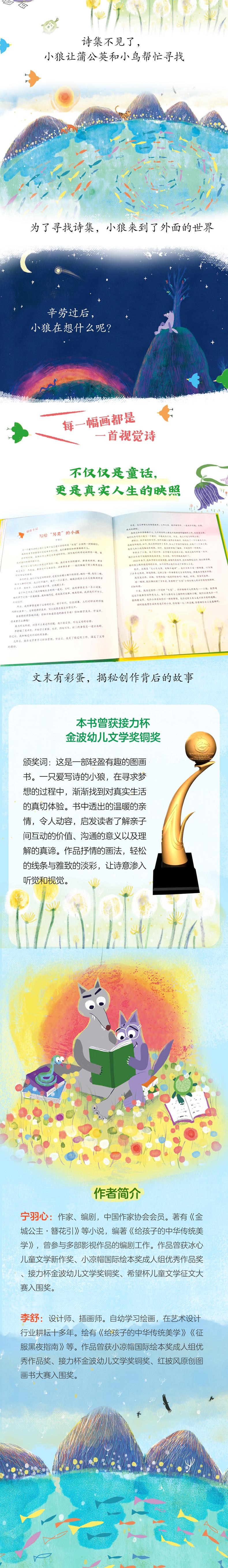 森林里有一只爱写诗的小狼,他整天沉浸在写诗中,眼睛近视了,尾巴也秃了。狼妈妈很发愁,让他学抓兔子、学挖洞……可他总是做不好。狼妈妈生气地“扔掉”了他的诗集。伤心的小狼决定找回诗集,在寻找的过程中慢慢体会到了真实生活的滋味,也找到了自己真正的梦想。