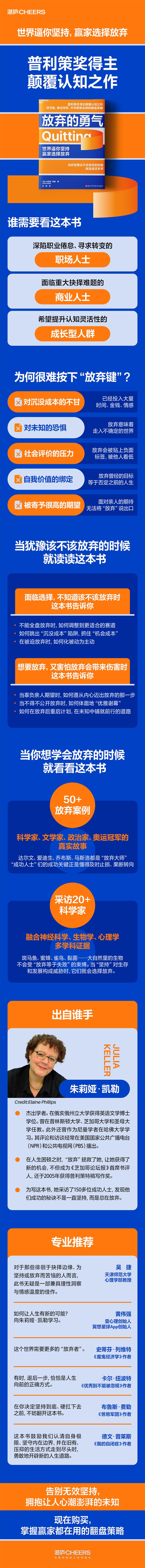 如何在无法完全放弃时采用“准放弃”策略、如何在难以抉择的事业中突破沉没成本陷阱、如何在复杂的情感期望中顺利放弃、在社交媒体时代如何得体地公布放弃、如何应对放弃带来的多面影响。
