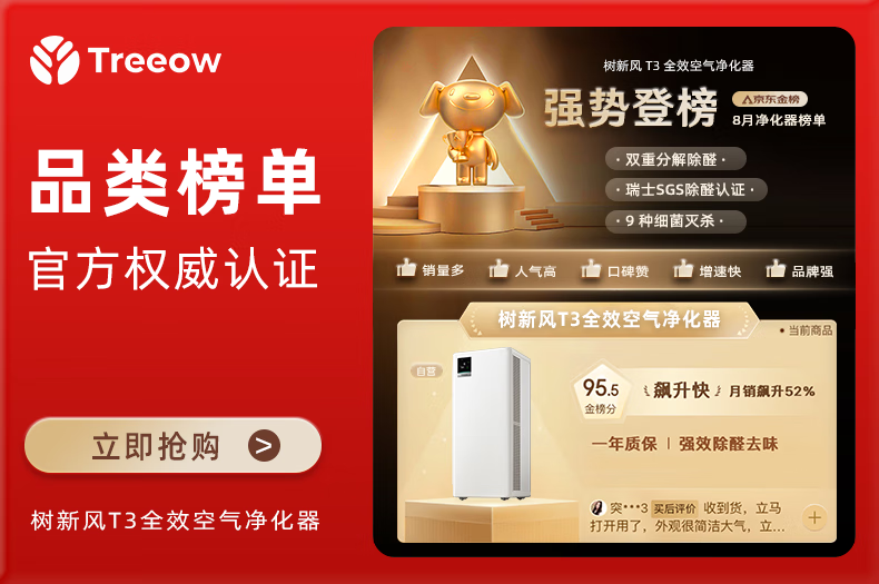 树新风空气净化器除甲醛猫毛TVOC异味除菌除花粉过敏认证家用大空间全效净化器T3