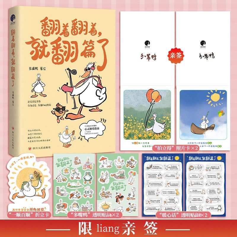 5.精美双封,内页全彩印刷,随书附赠 “多嘴鸭”透明**×2,“暖心话”透明**×2 ,“拍立得”照片卡×2 ,“一顺百顺”折立卡。