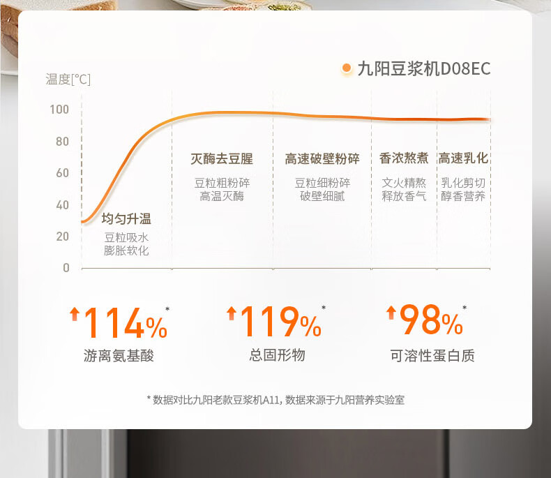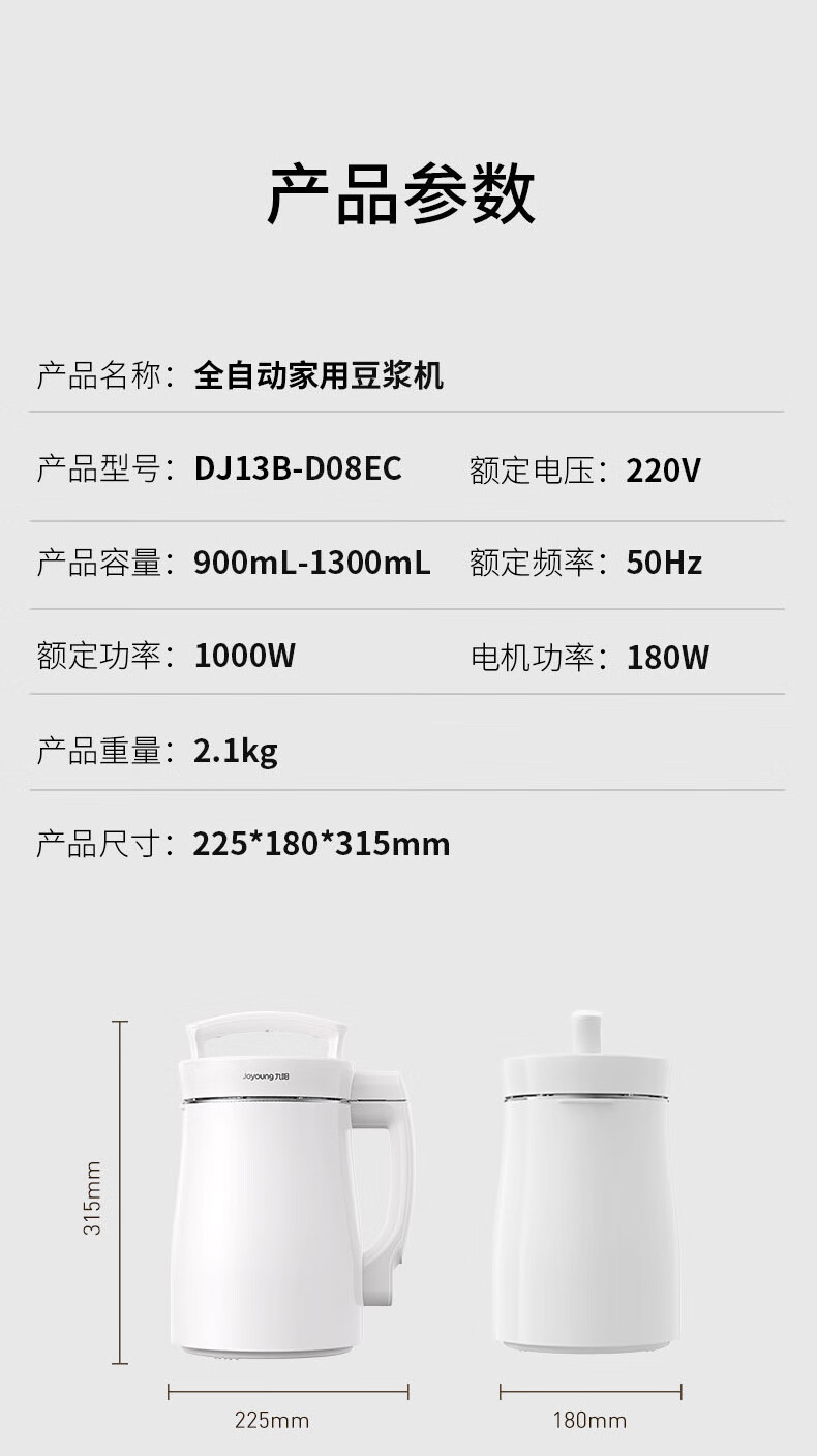 九阳(Joyoung)豆浆机1.3L破壁免滤轻音降噪304不锈钢3-4人用家用多功能全自动榨汁机料理机D08EC