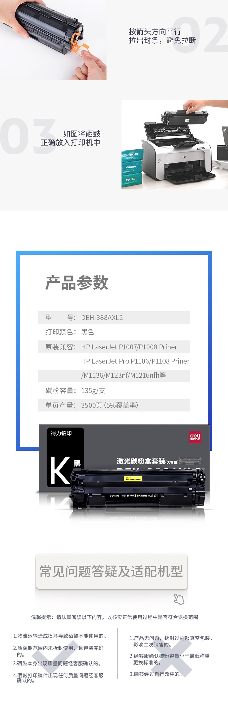 得力(deli)388a黑色硒鼓 适用惠普打印机HP P1008 P1106 P1108 M1136 M126a M126nw M128fn硒鼓
