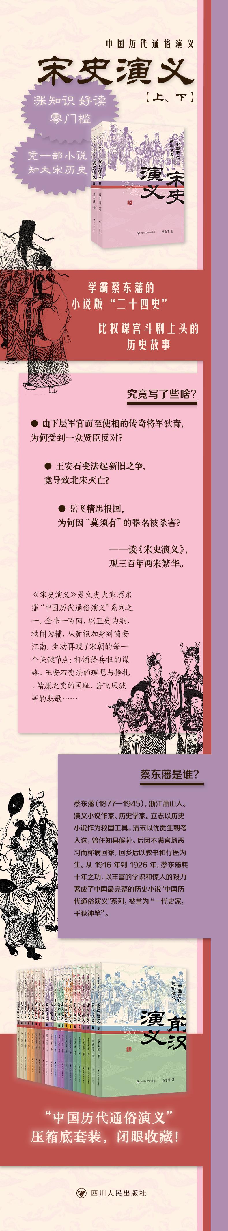 《宋史演义》是文史大家蔡东藩“中国历代通俗演义”系列之一。全书一百回,以正史为纲,轶闻为辅,从黄袍加身到偏安江南,生动再现了宋朝的每一个关键节点:杯酒释兵权的谋略、王安石变法的理想与挣扎、靖康之变的国耻、岳飞风波亭的悲歌……看大宋王朝如何在内忧外患中走向终点。此外,每一回末附有精辟回评,文中穿插夹评,作者评者引证史料、辨析异同,使读者能更好地了解古代官制、地理、名物、方言等。读此书,既是读一段跌宕历史,也是上一堂生动的历史文化通识课——在波澜壮阔的叙事中,读懂一个时代的兴衰与人性浮沉。