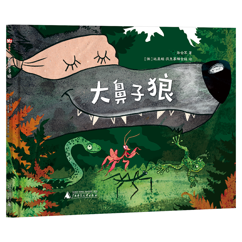 《大鼻子狼》:大鼻子狼有一个非常灵敏的鼻子,这一天,它和其他动物决定玩一场捉迷藏。游戏开始了,大鼻子狼挨个找到了“伪装大师”——苔藓蛙、竹节虫、兰花螳螂、翠青蛇、叶尾壁虎和树皮鸟,将它们一个个装进了口袋。然而,就在大鼻子狼张开爪子抓向另外一只动物臭鼬时,大鼻子狼瞬间被一股臭味熏得差点儿晕过去。小动物纷纷从大鼻子狼的口袋里逃出来,游戏结束。阅读本书,孩子可以在一藏一找的游戏中观察、认知小动物,有效锻炼专注力。