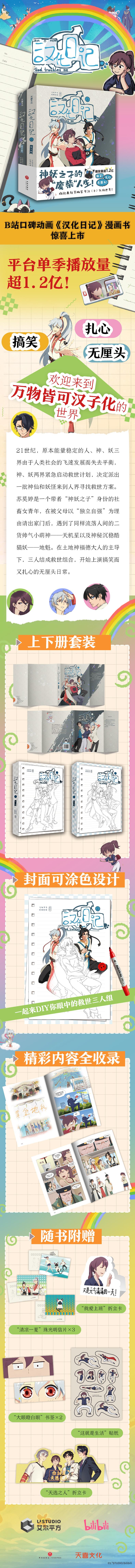 本书是根据B站热门系列动画《汉化日记》第一季改编而成,该系列动画累计在B站播放量达2.8亿,站内评分9.8分。《汉化日记》讲述了在拟世界里的女青年苏莫婷与各种神仙妖怪们之间发生的种种有趣的故事。在仙、人、妖共处的世界中,人类发展过快导致整个世界逐渐失去平衡。为了寻找救世的方案,仙和妖住进苏莫婷家中去体验和感受人类的真正想法。天机星化为苏莫婷的手机,猫妖地魁则变身暹罗猫,二者和苏莫婷一起上演了欢乐、温馨又无厘头的日常。本书故事取材于当代青年的日常生活,趣味解读了诸多有意思的话题,有很强的可读性。