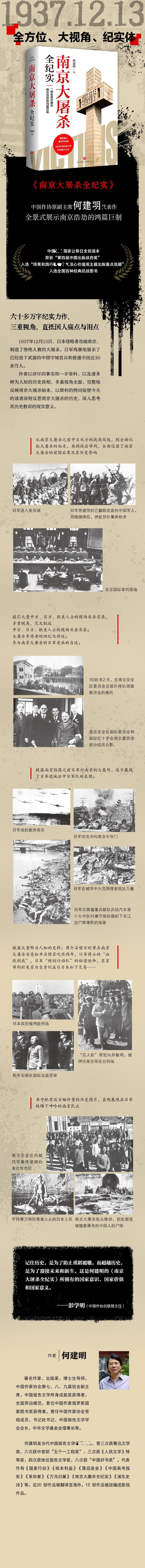 1937年12月13日,日本侵略者攻破南京城,随后几周,制造了惨绝人寰的大屠杀,日军残暴地屠杀了已经放下武器的中国守城官兵和普通市民达30余万人。 作者以详尽的事实和一手资料,以及诸多鲜为人知的历史真相,多重视角全面、完整地反映南京大屠杀始末: ◎ 中方、日方、欧美人士的现场目击实录; ◎ 大屠杀幸存者的回忆与讲述; ◎ 参与南京大屠杀的日军老兵的自述; ◎ 披露南京陷落之前日军对南京的大轰炸; ◎ 逐日展现了日军进城后中日军队的表现; ◎ 披露大量鲜为人知的史料:川军将士的“血战到底”,日军“特别行动队”的秘密使命,东京大审判为何为“世纪大审判”?? 《南京大屠杀全纪实》以犀利的拷问促使今天的读者深刻反思南京大屠杀的历史,深入思考其历史教训的现实意义。