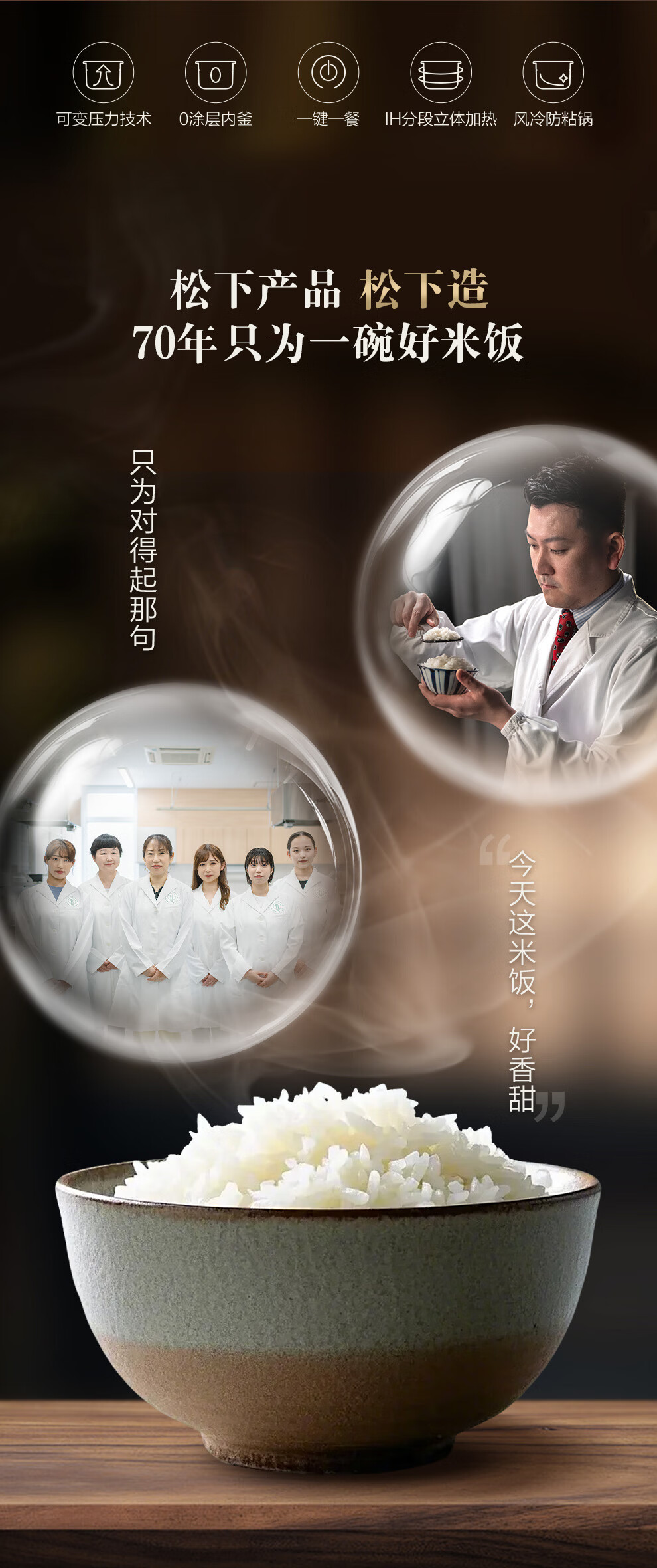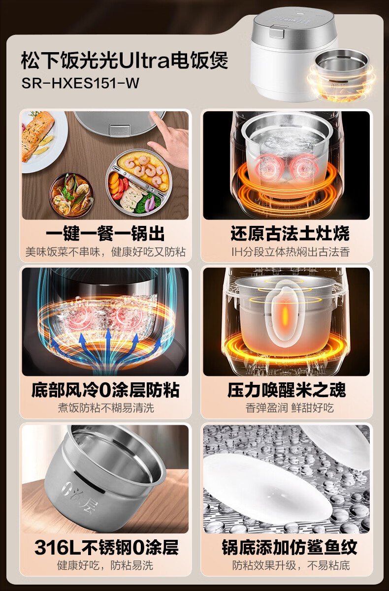 松下(Panasonic)旗舰款饭光光Ultra电饭煲0涂层家用无涂层电饭锅4-5人压力不锈钢IH加热3.8升HXES151