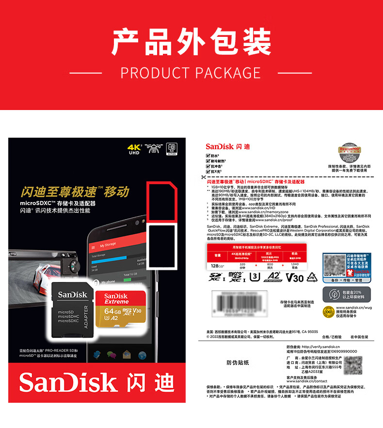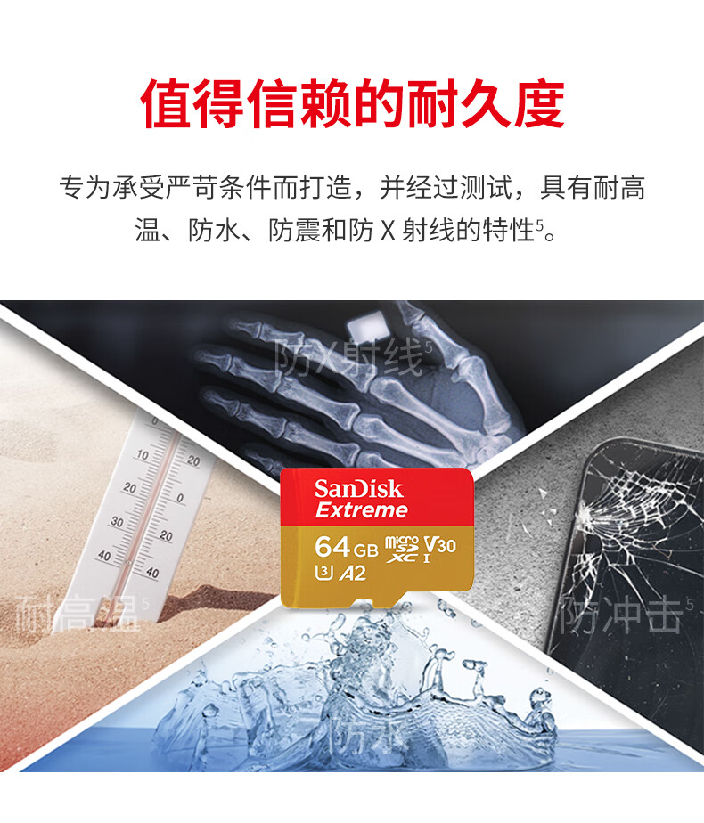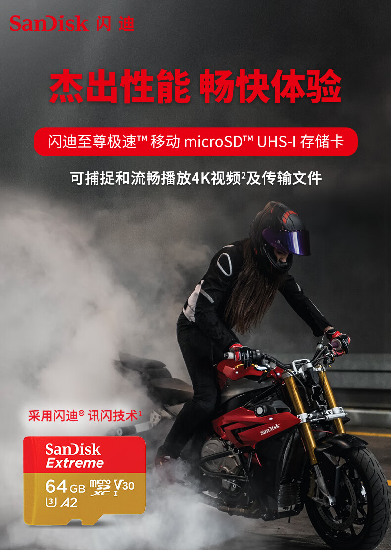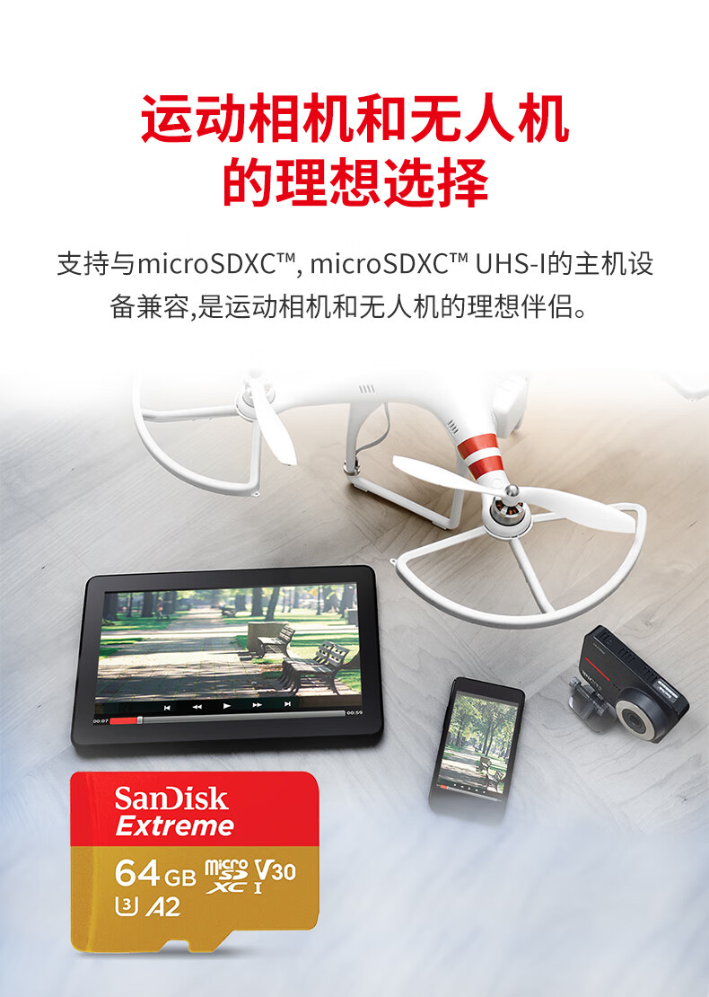 闪迪(SanDisk)64GB TF(MicroSD)内存卡 4K极速金卡A2 V30 U3行车记录仪 运动相机无人机 监控存储卡 读170MB/s